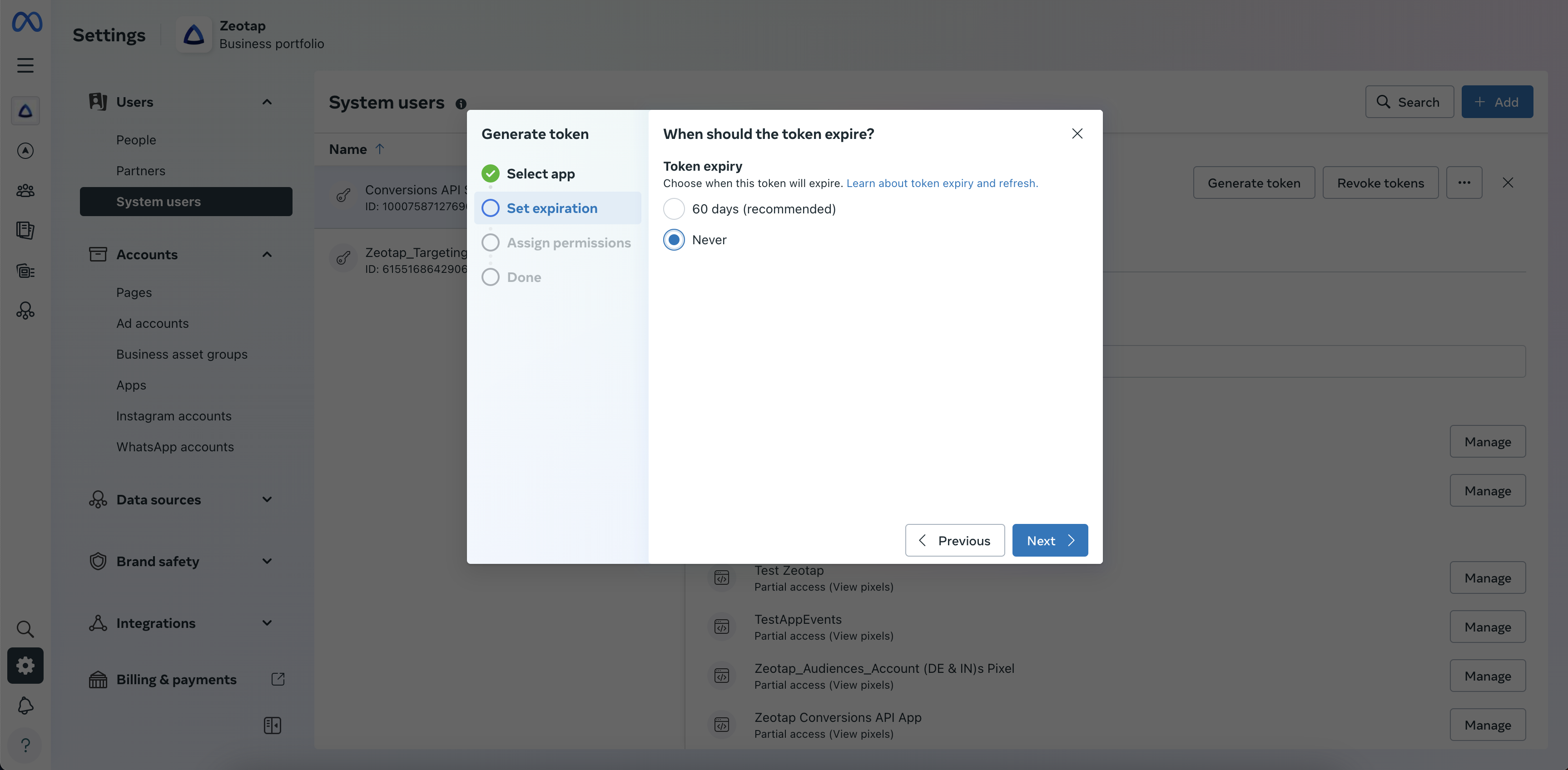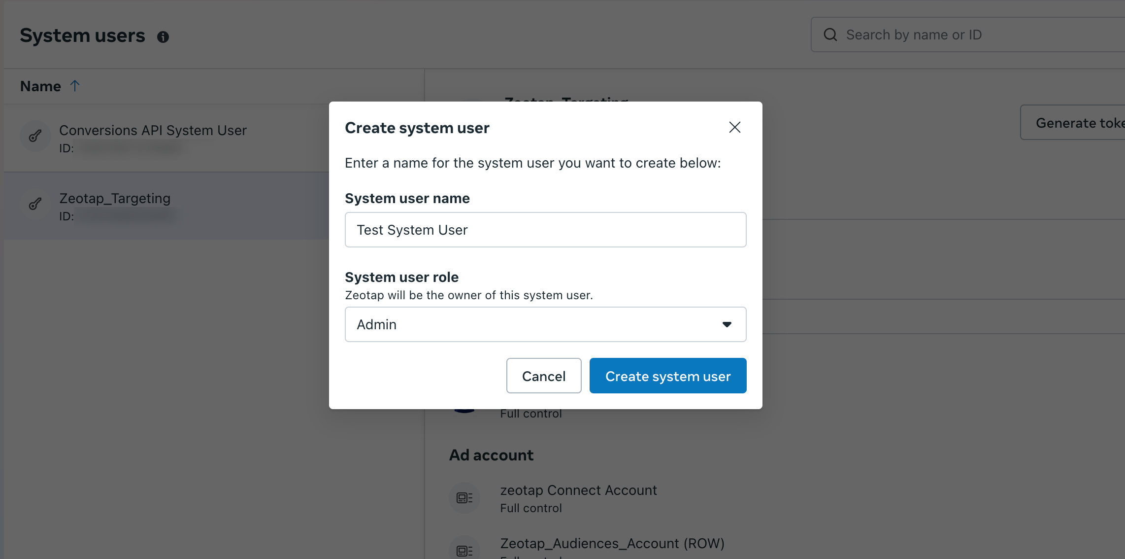 Access Token is an unique identifier that is required for authenticating Zeotap CDP on the Facebook platform. The following are the two types of access tokens that you can generate:- System User Access Token - A System User Access Token is used if your app performs programmatic, automated actions on your business clients’ Ad objects or Pages without having to rely on input from an app user, or require re-authentication at a future date. Learn more