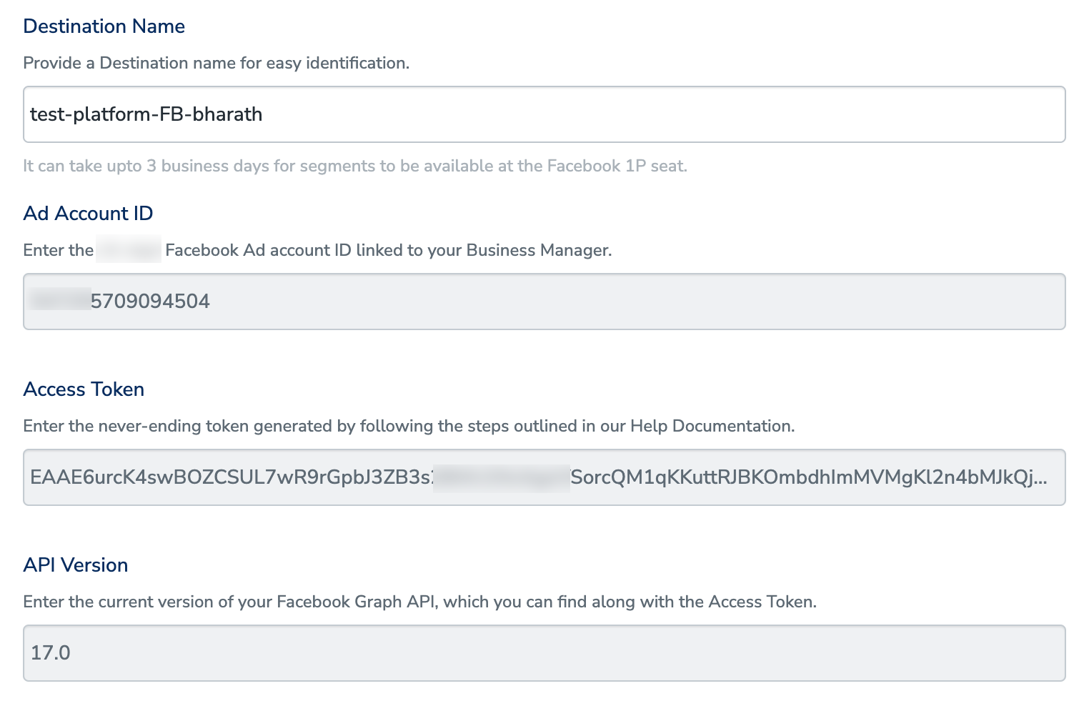 a. Enter a name for the Destination.b. Enter the Ad Account ID number associated with Facebook Business Manager.c. Enter the Access Token that you have obtained as mentioned in the section above.d. Enter the API Version.e. Review all the values entered above and then click Next to proceed.
