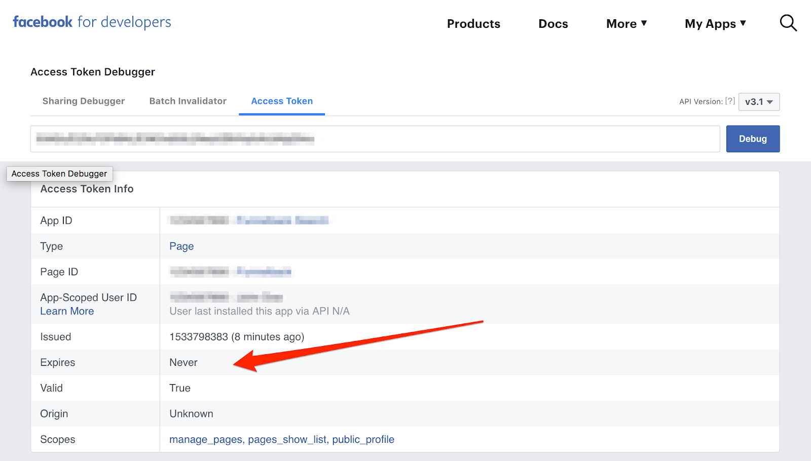 Navigate to and click Debug. The page appears where you can find the full information for the short-lived user access token. Note that the short-lived user access token expires after an hour.