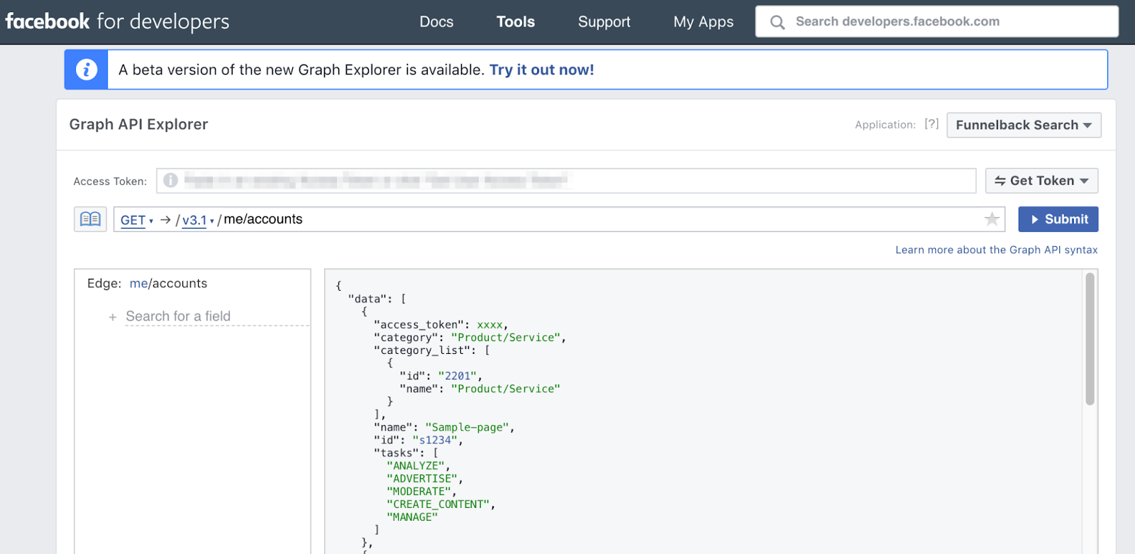 Go to and paste the recently created long-lived user access token in the Access Token field. Perform the following steps:a. Change the API endpoint to access /me/accounts and click Submit. This displays the result with information about all the pages including the page access token, which is a never expiring token that is used to authenticate all the requests.b. Copy the access token of the relevant page and the API version used in the request to generate the token. This information is required when you set up a Destination within the Zeotap CDP App.
