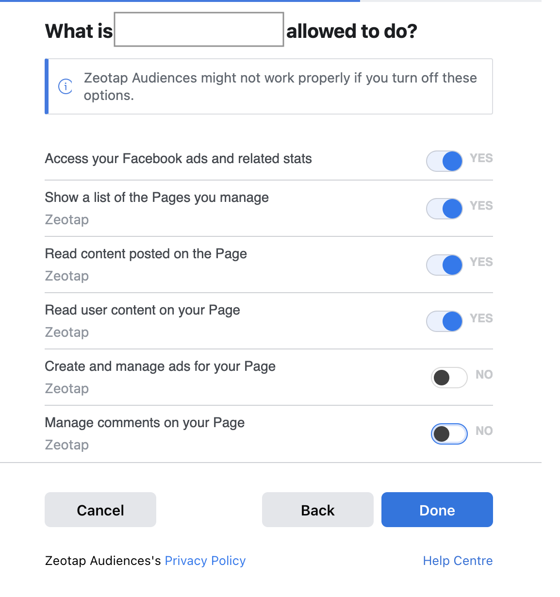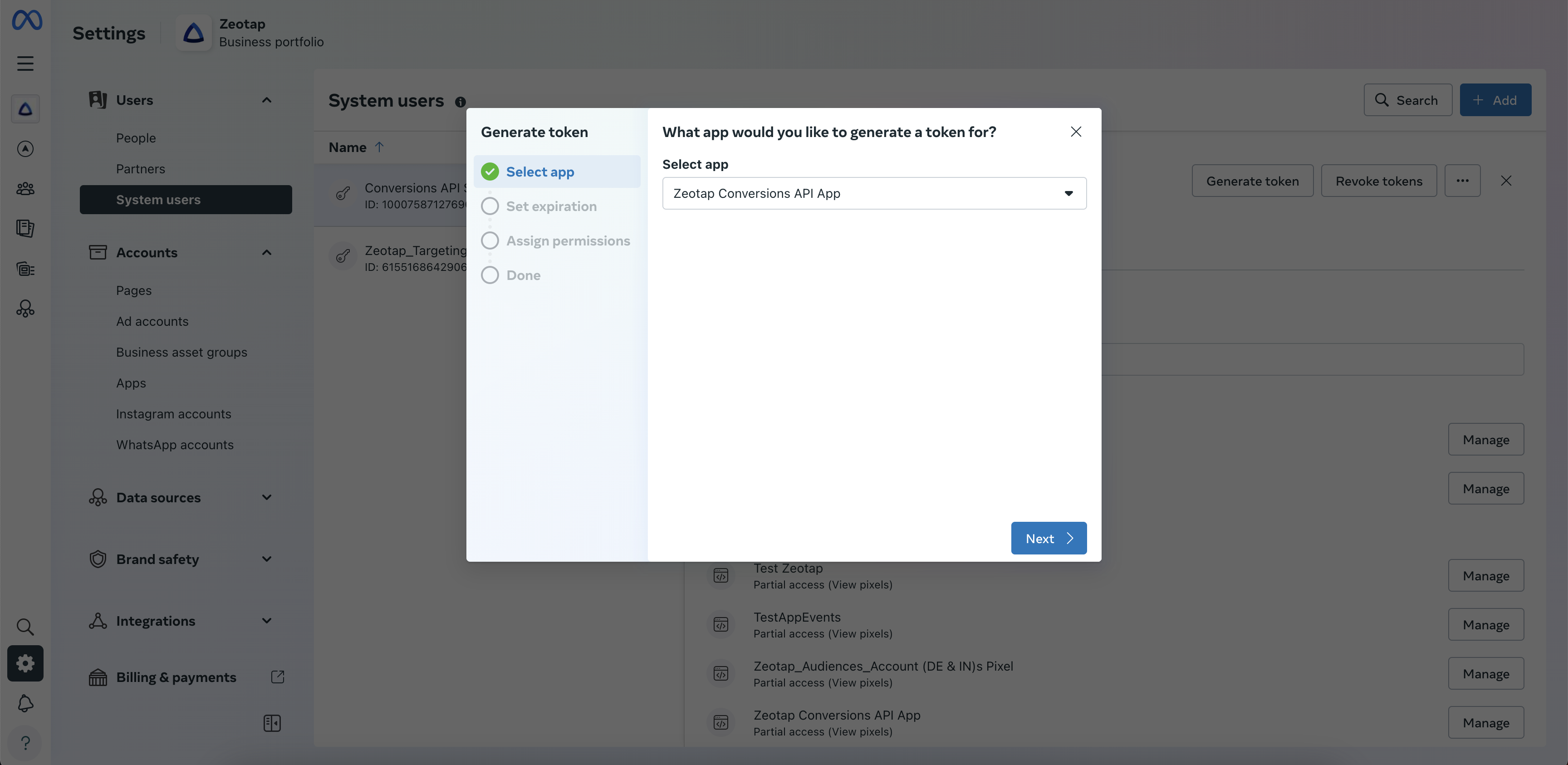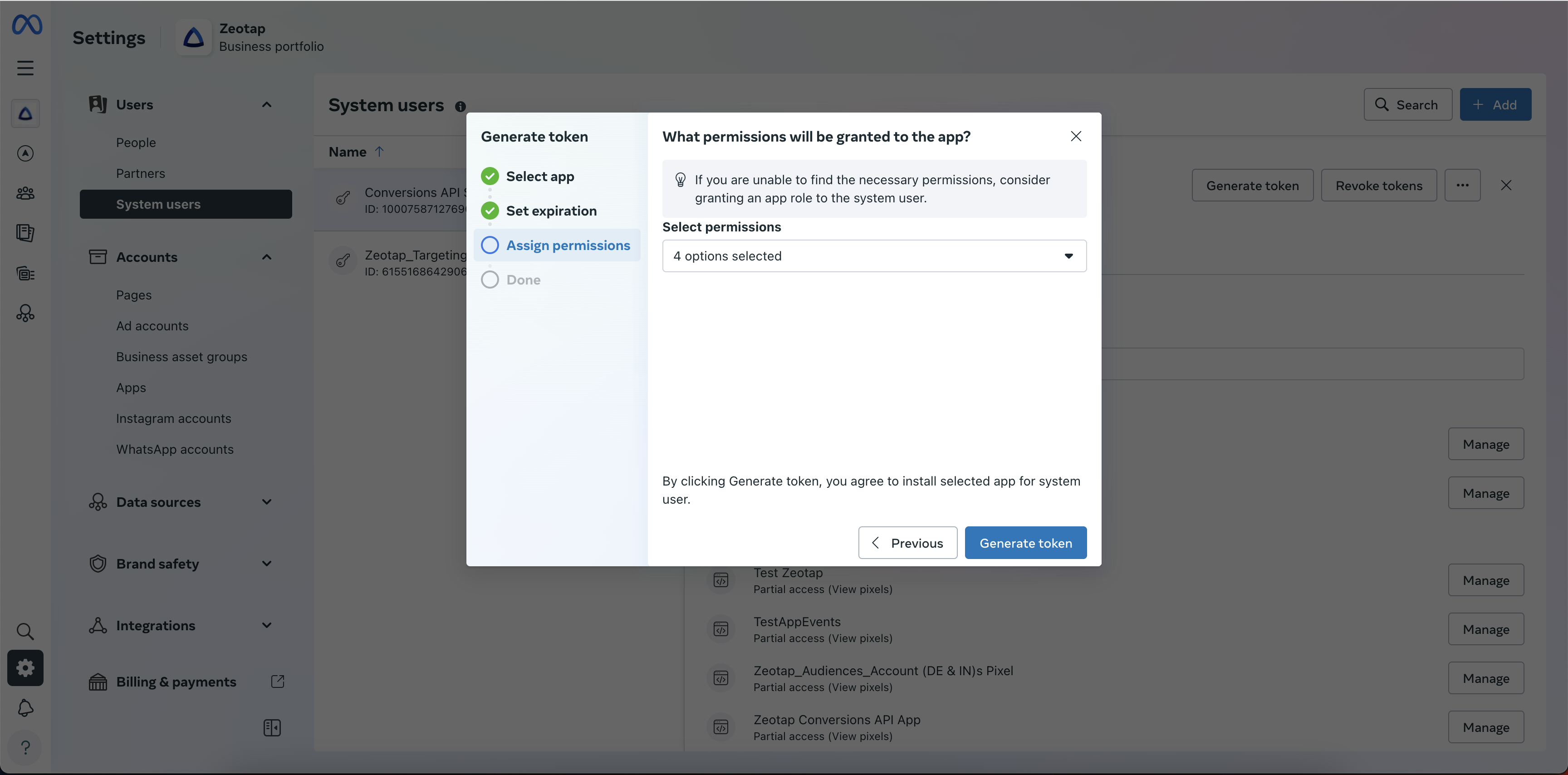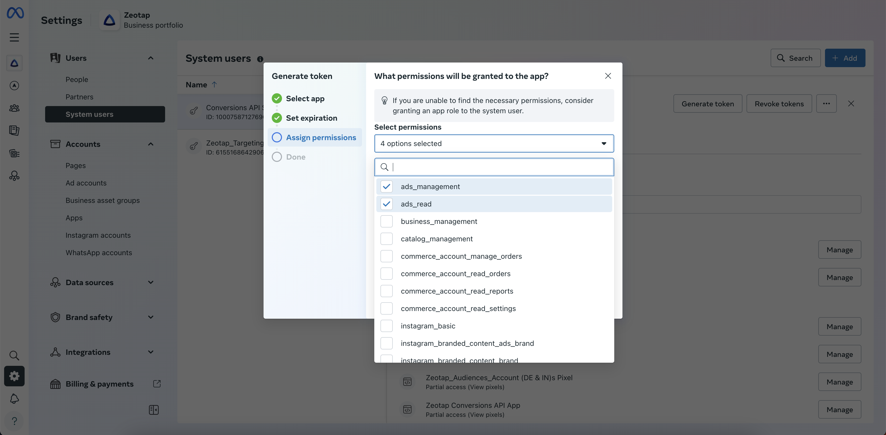 - Obtain Access Token required for authenticating Zeotap CDP on the Facebook platform