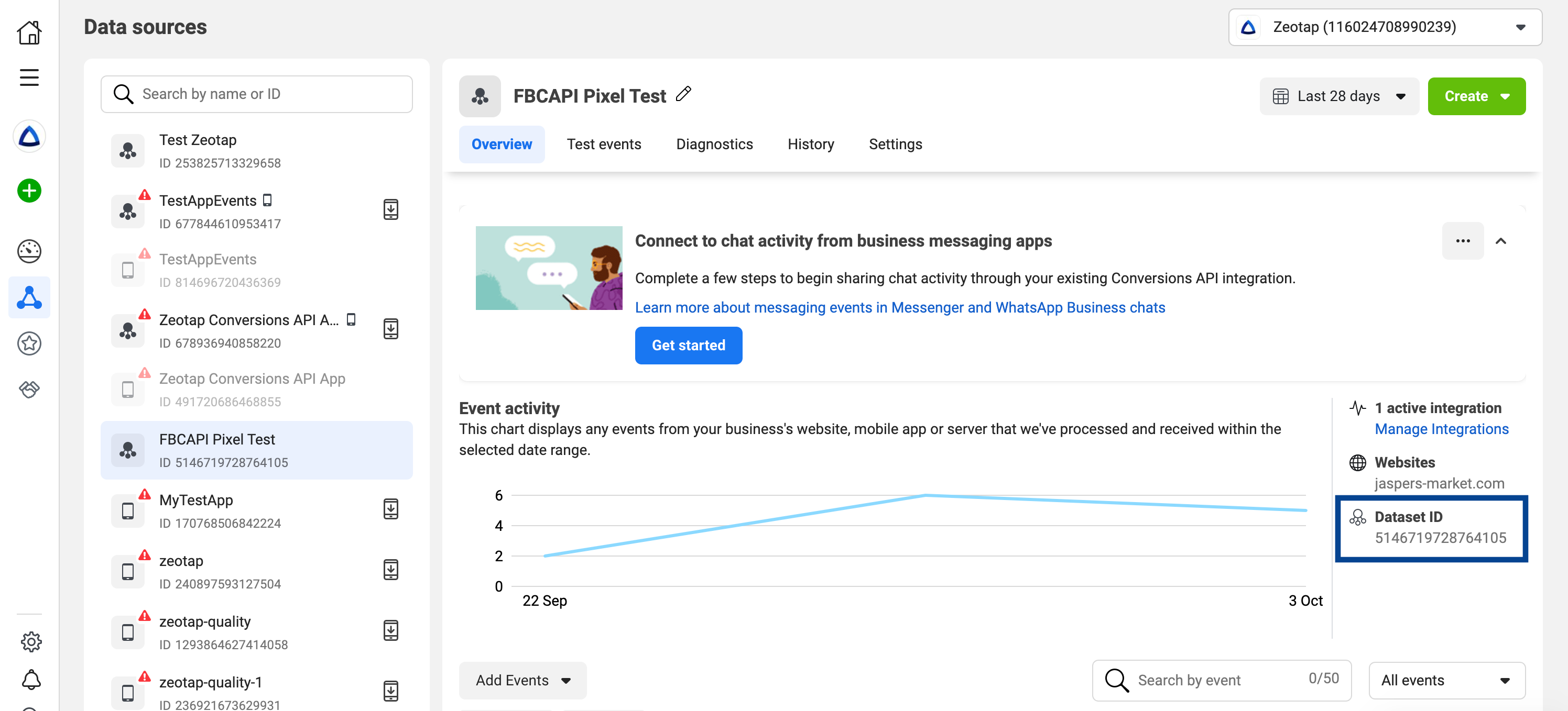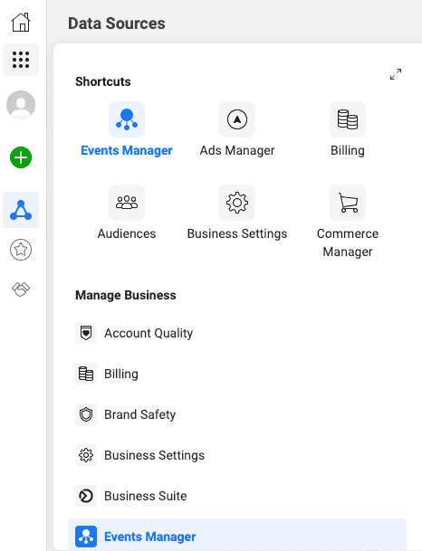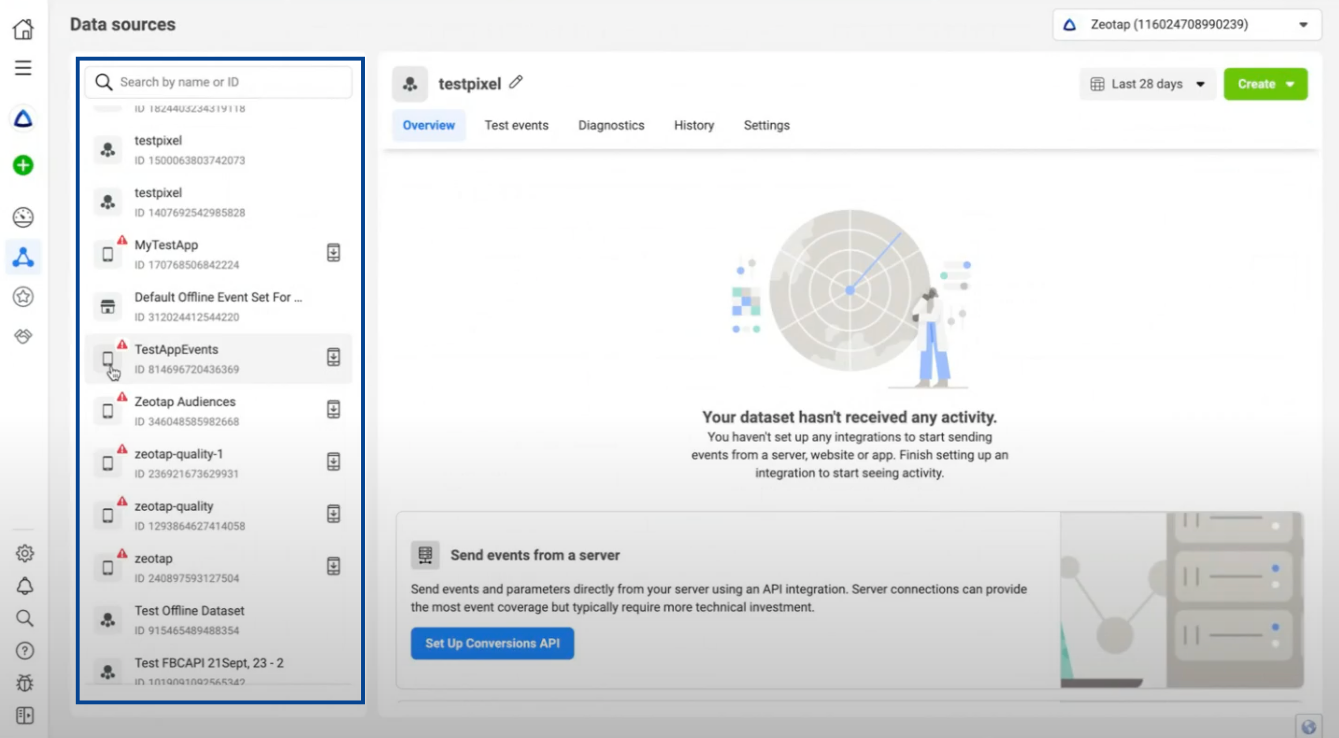Once you create an App in the Developer’s page, the app gets listed in Facebook Events manager under the Data sources tab as shown below.