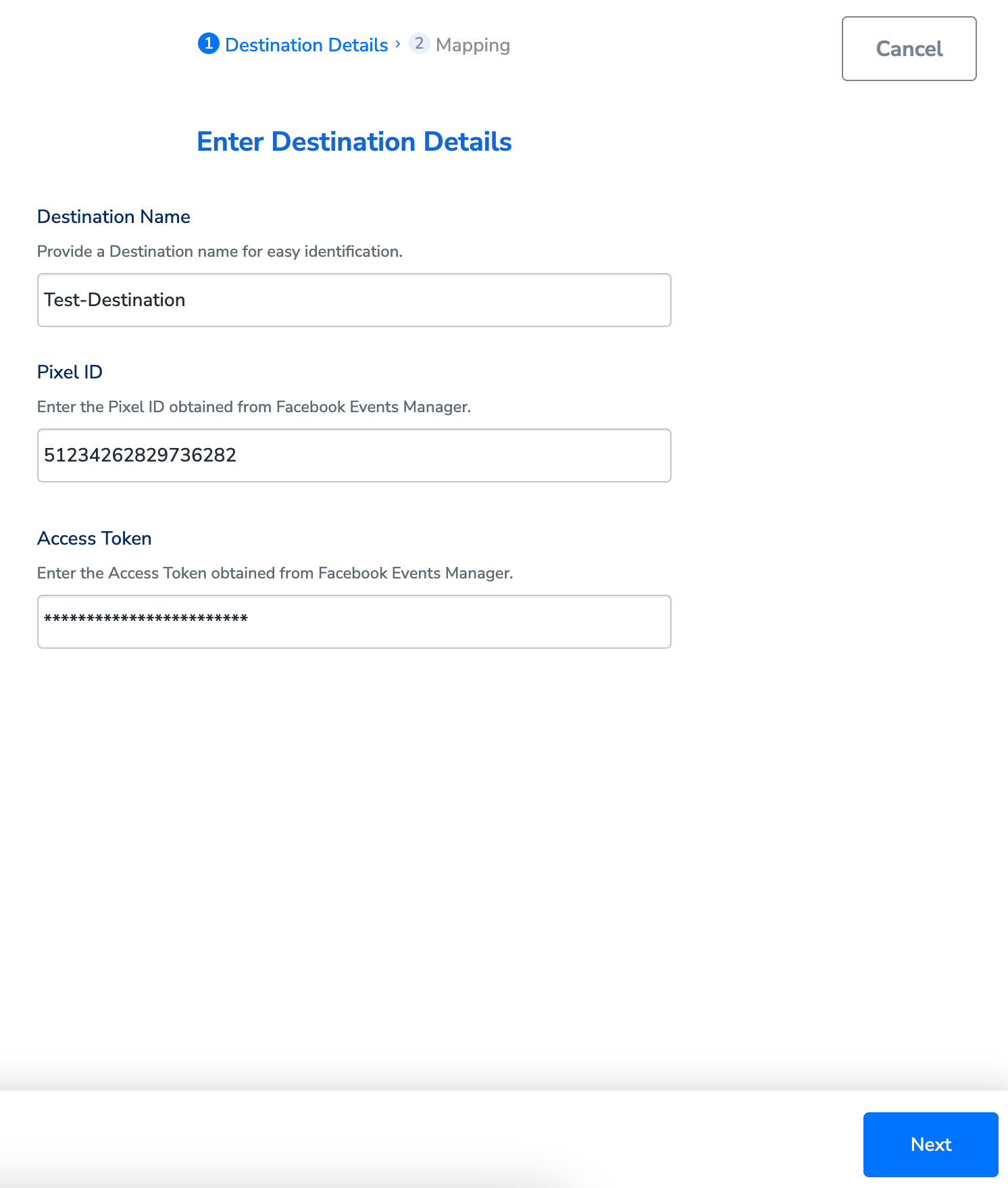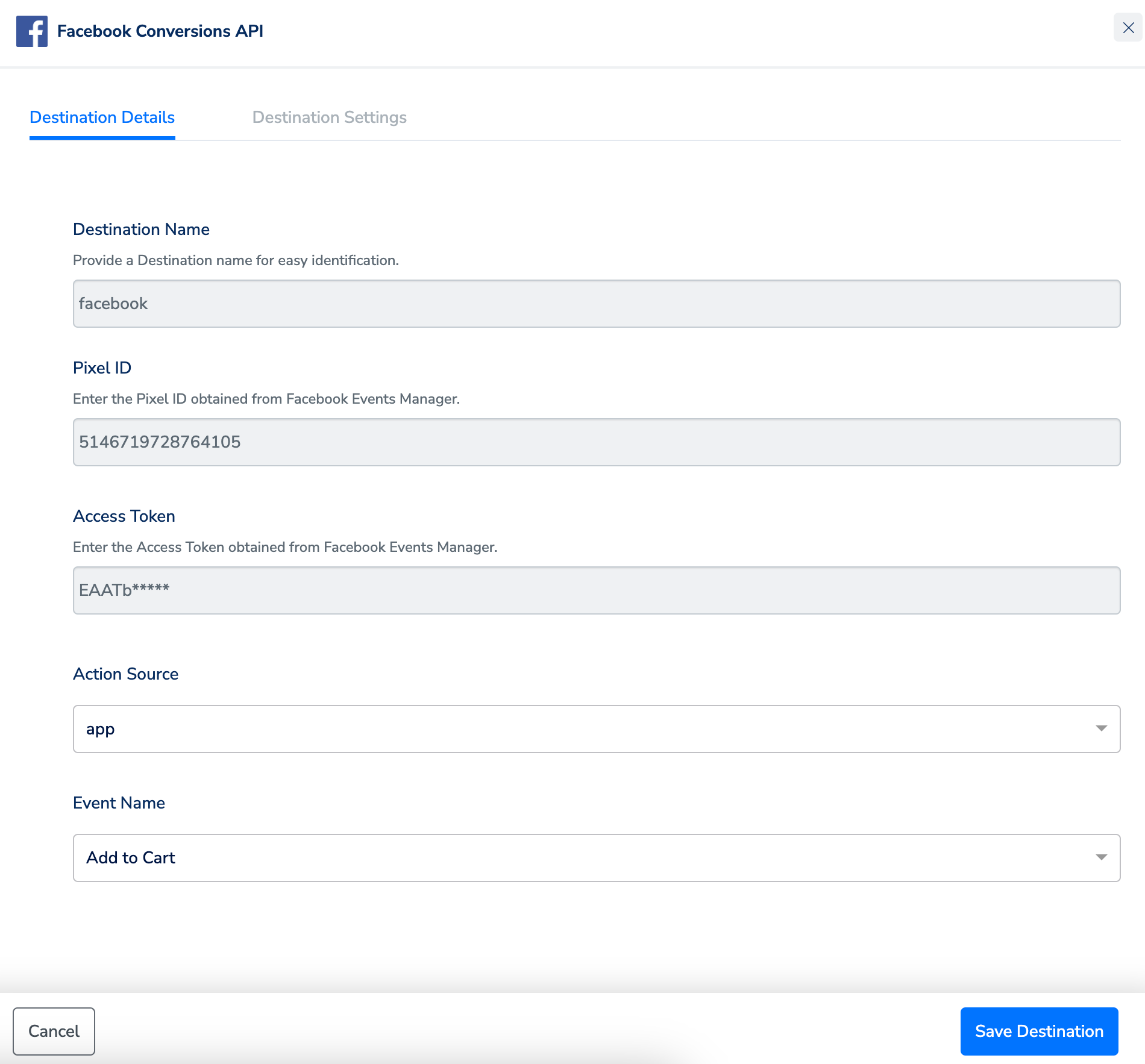 Note that you need to have a Business Manager to use the Conversions API. This helps advertisers integrate Facebook marketing efforts across your business and partners. For more information on how to create a Business Manager account, refer to the article how to Create a Business Manager.Destination Setup