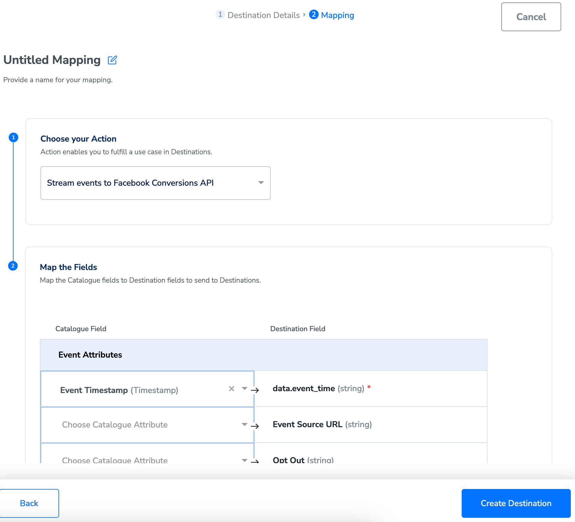Perform the following steps to add a new destination:In the mapping screen that appears, under Choose your Action, you can either choose Stream events to Facebook Conversions API or Send offline data to FB Enhanced CAPIas the action based o your use case for sending data from the workflow created in Journeys.a. If you choose Stream events to Facebook Conversions API as the action, then, under Map the Fields, certain fields like Email, Phone, First Name, Last Name and so on, which are relevant to Conversions API auto populates. You can map the Zeotap Catalogue fields to the appropriate Conversions API fields (Destination fields).If the suggested object properties do not suit your requirements, then you can add custom data that can then be mapped to the relevant Zeotap field and sent to Facebook. Note that Custom properties can be used with both standard and custom events. For more information about Standard and Custom events, refer here.