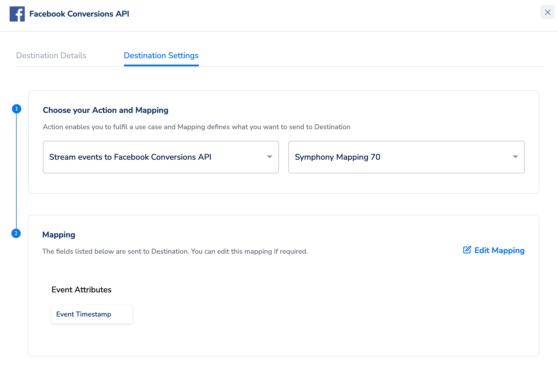 After you have decided on the use case for your integration, specify the events and parameters that you want to send to Facebook. You can choose this in the Actions and Mapping screen while creating the Destination. Note that you can send events attributes, user data, app data and custom data to Conversions API.Choose a Deduplication Strategy