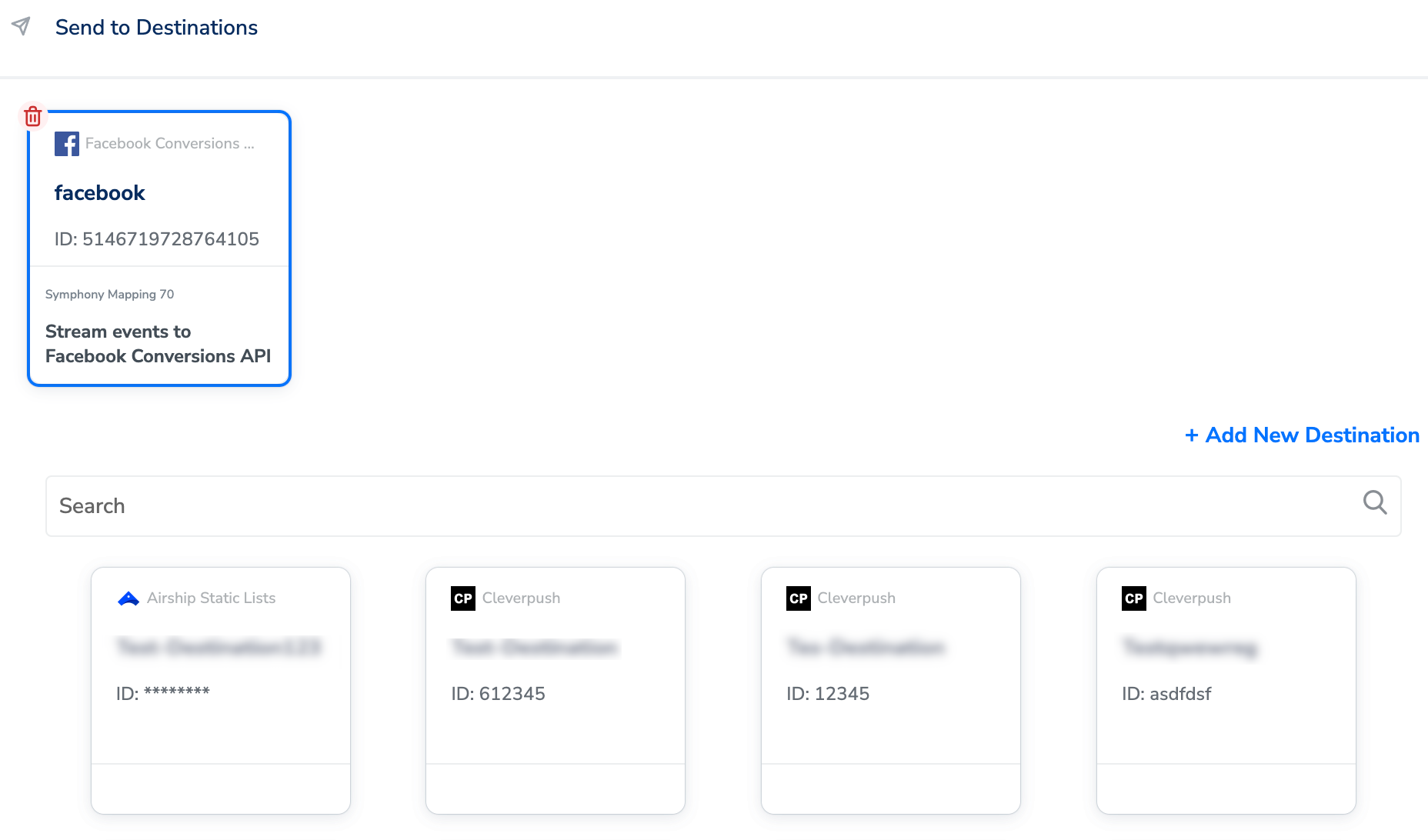 After you have applied filters or added conditions for your users in Journeys, you can activate them in Facebook Conversions API under Send to Destinations. A new window appears, where you can set up your destination. You can use an already existing destination from the list of available Destinations **** or create a new one by clicking + Add New Destination.