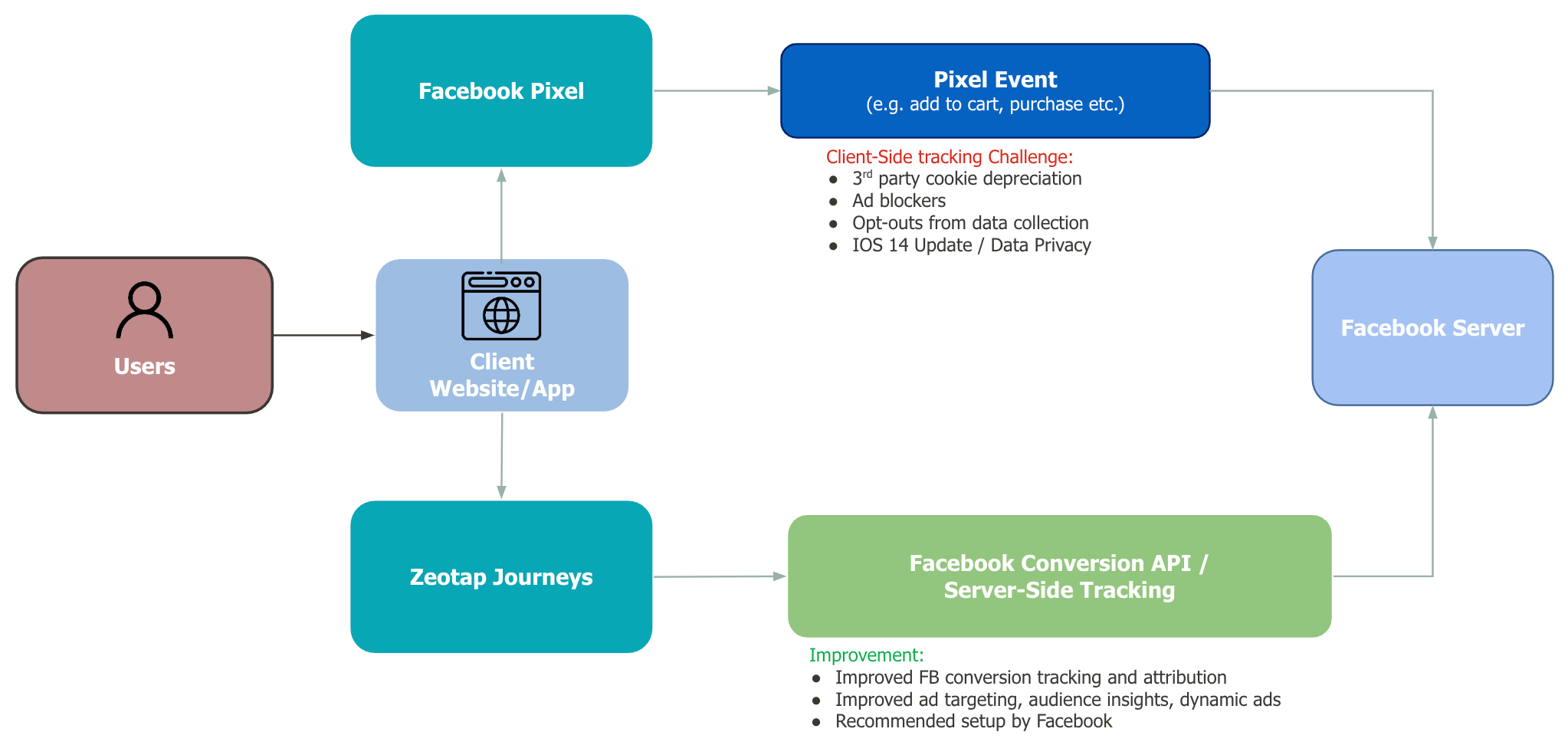 Advertisers do not want to send the same event twice through the Conversions API and the Facebook Pixel as it results in the duplication of events. Hence, deduplication is necessary. We recommend an approach that enables the deduplication of events sent through the Facebook Pixel on the web and the Conversions API. Our recommended approach is that you must ensure both events (Pixel and Conversions API) use the identical Event Name. Also, ensure that either Event Id or a combination of External Id and FBP is included. We recommend you include all these parameters to help Facebook properly deduplicate events and reduce double reporting of identical events. Based on the combination of parameters that you choose, ensure that you ingest the respective attributes to Zeotap and map them within Zeotap CDP. For more information about the Deduplication Strategy, refer here.Components of the Conversions API