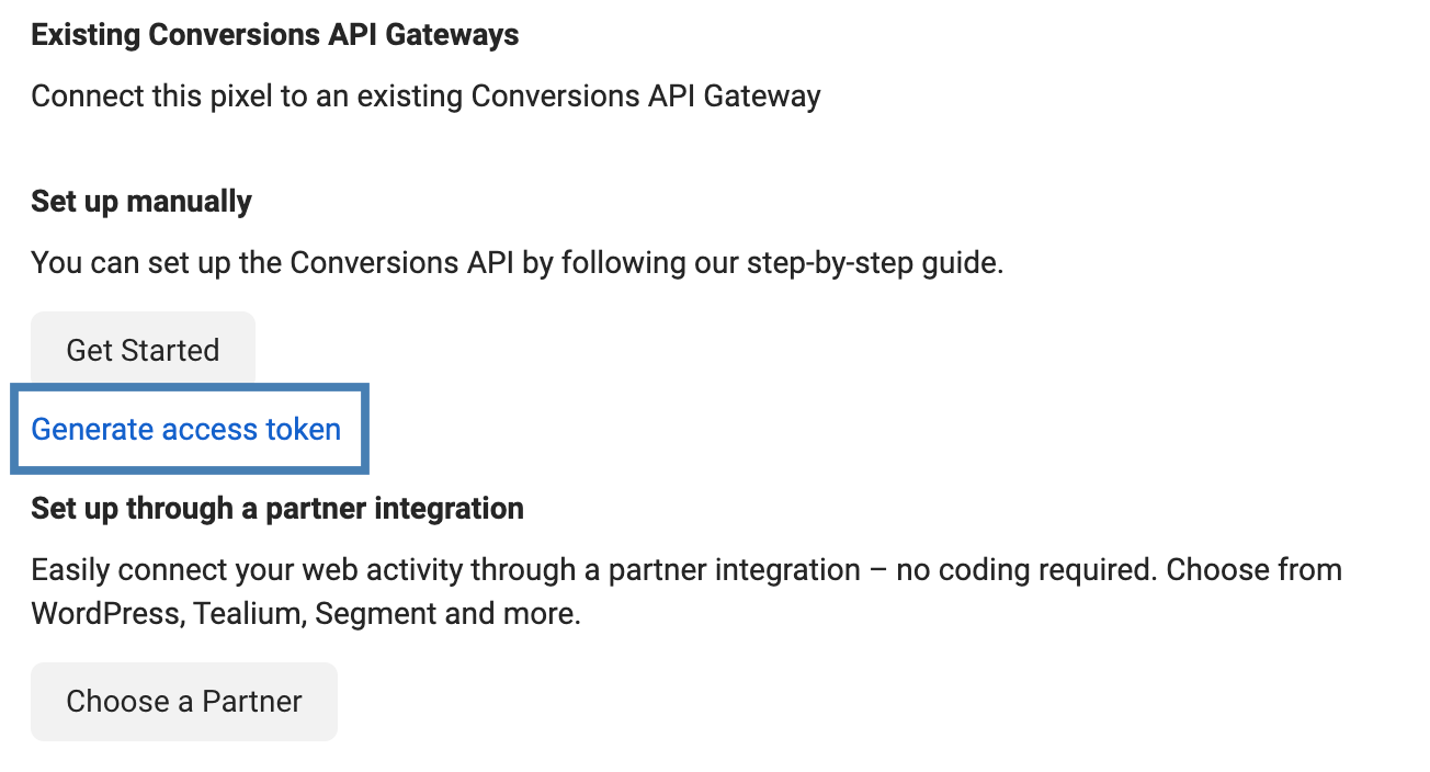 The following are the high-level steps for setting up the Conversions API integration:- Choose the integration method that is right for you. For example, Web, App and so on.