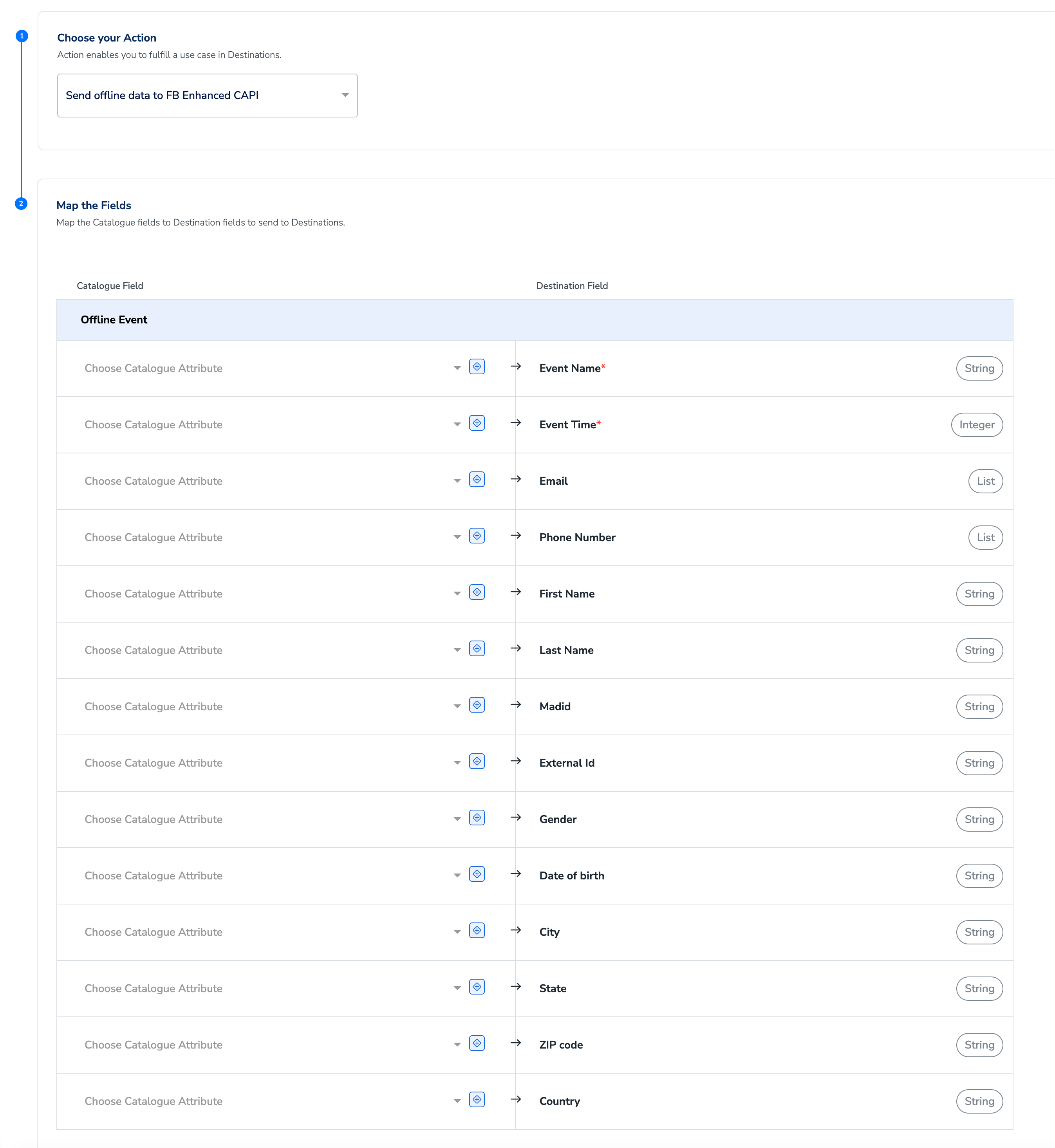 In the new screen that appears, under Choose your Action, choose Send offline data to Facebook Enhanced CAPI as the action for activating your audience (segment) on the Audiences module. This auto-populates Event Name, Event Time, Email, Phone number, Name and more under Map the Fields, as shown in the image below. Map the required Catalogues fields to the corresponding Destination fields. Note that mapping Event Name and Event Time is mandatory. Otherwise, the destination fails.