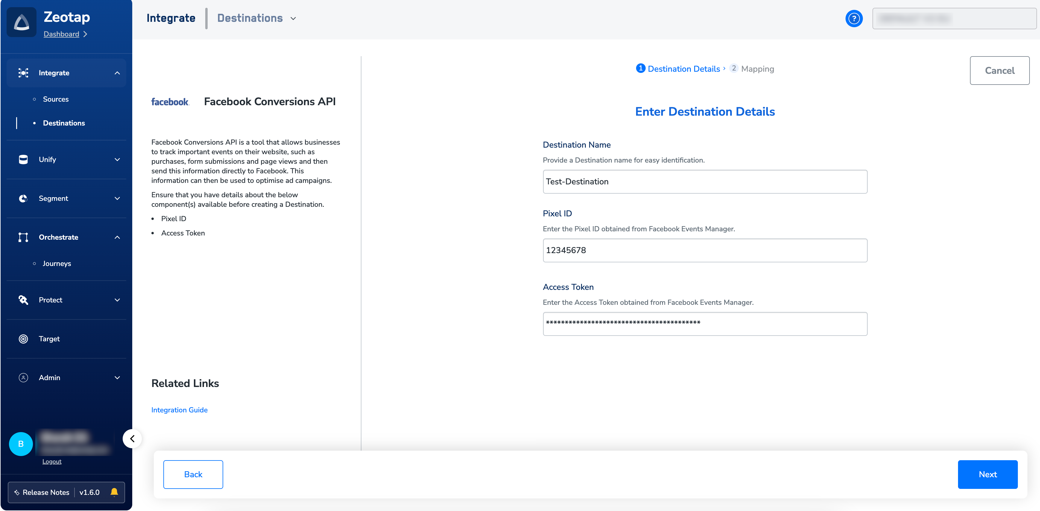 Before creating a destination in Zeotap CDP, ensure you have the following details:- Meta Pixel ID – Required to associate conversion data with your Meta Ads account.