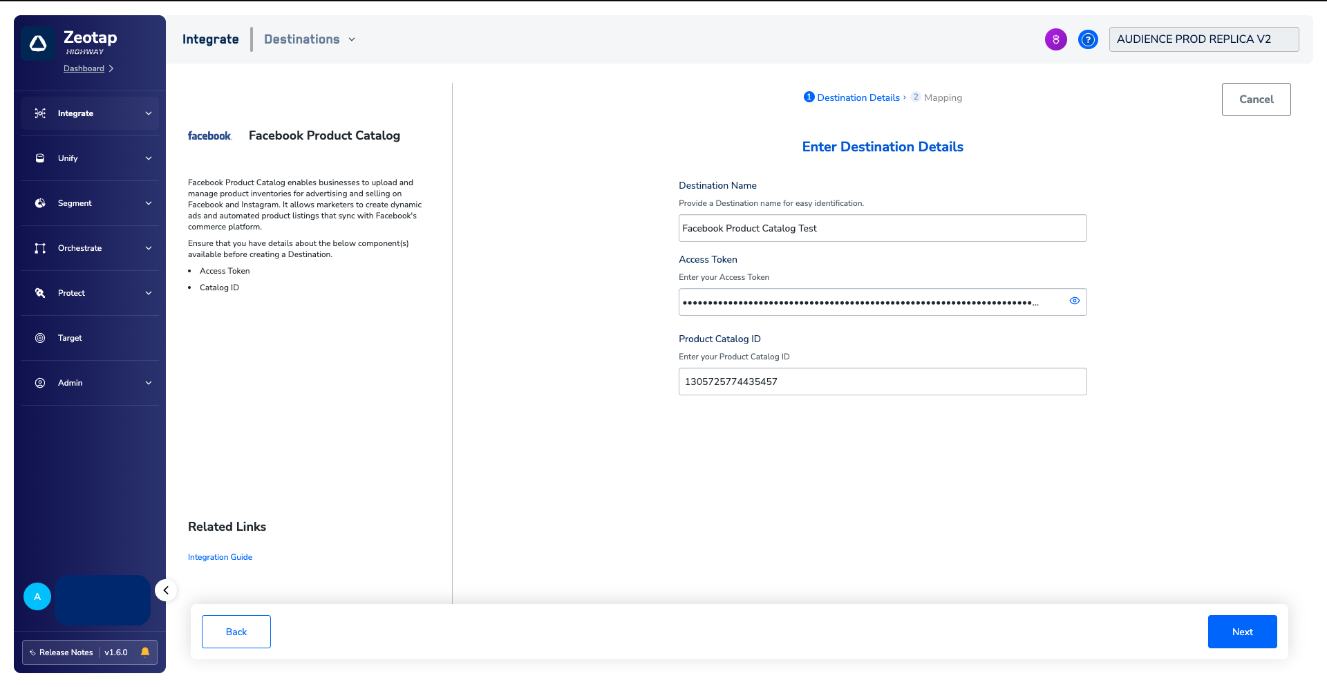 Perform the following steps to create a Destination for Facebook Product Catalog: