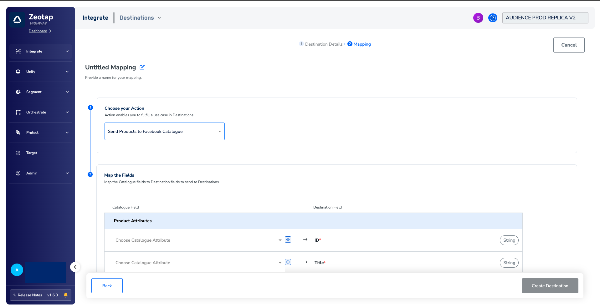 In the new screen that appears, choose the appropriate Action and mapping as explained below.a. Choose the desired action under Choose your Action and then choose the corresponding product attributes under Map the Fields. By default, the Output Identifiers that are accepted by the platform such as product ID, title, description, price, availability, brand, and more are displayed. However, you can edit, add or remove an attribute from the list. To do so, refer here.b. Click Create Destination. The created Destination gets listed in the Target and Audiences applications, which can be linked to a product feed.