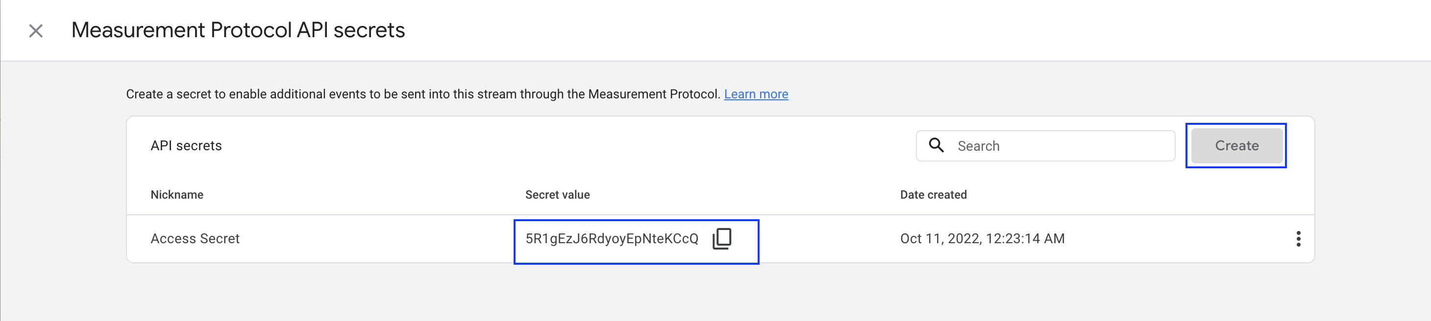 Scroll down and click the Measurement Protocol API secrets. A section appears on the right side displaying the existing API secrets and an option to Create a new one.