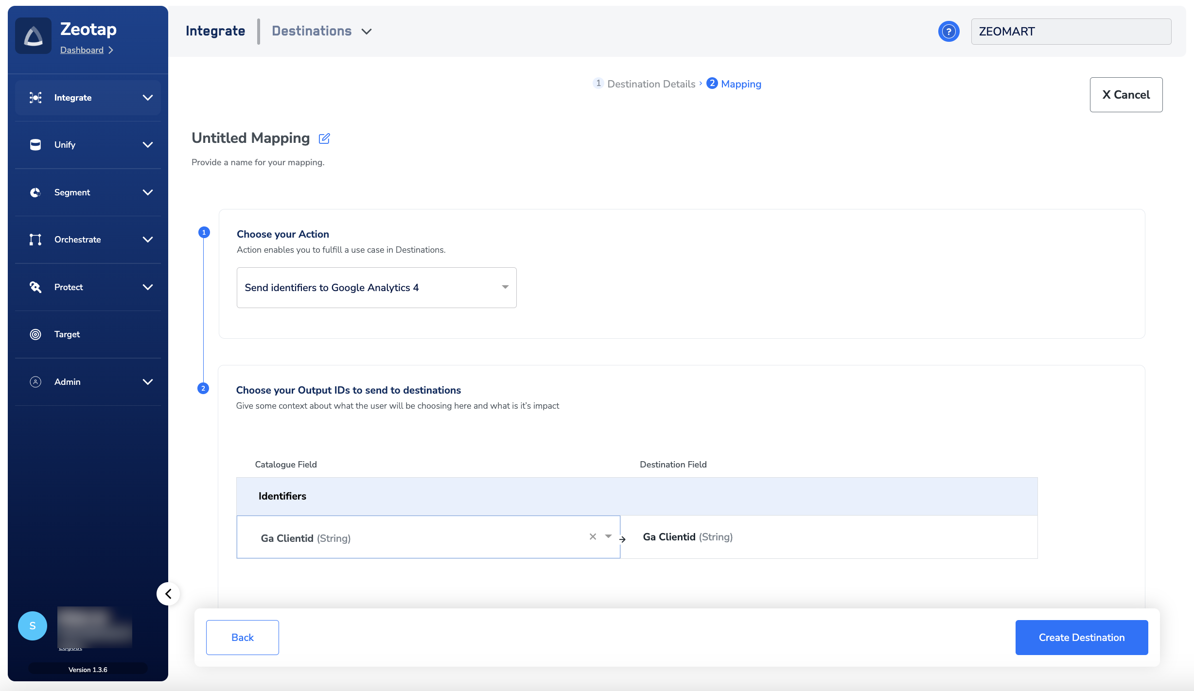 In the new screen that appears, choose the appropriate Action and mapping as explained below.a. Choose the desired action under Choose your Action and then choose the corresponding identifiers under Map the Fields. By default, the Output Identifiers that are accepted by the platform such as, MAIDs, Cookies, email Ids and more are displayed. However, you can edit, add or remove an identifier from the list. To do so, refer here.b. Click Create Destination. The created Destination gets listed in the Audiences application, which can be linked to an Audience/segment.
