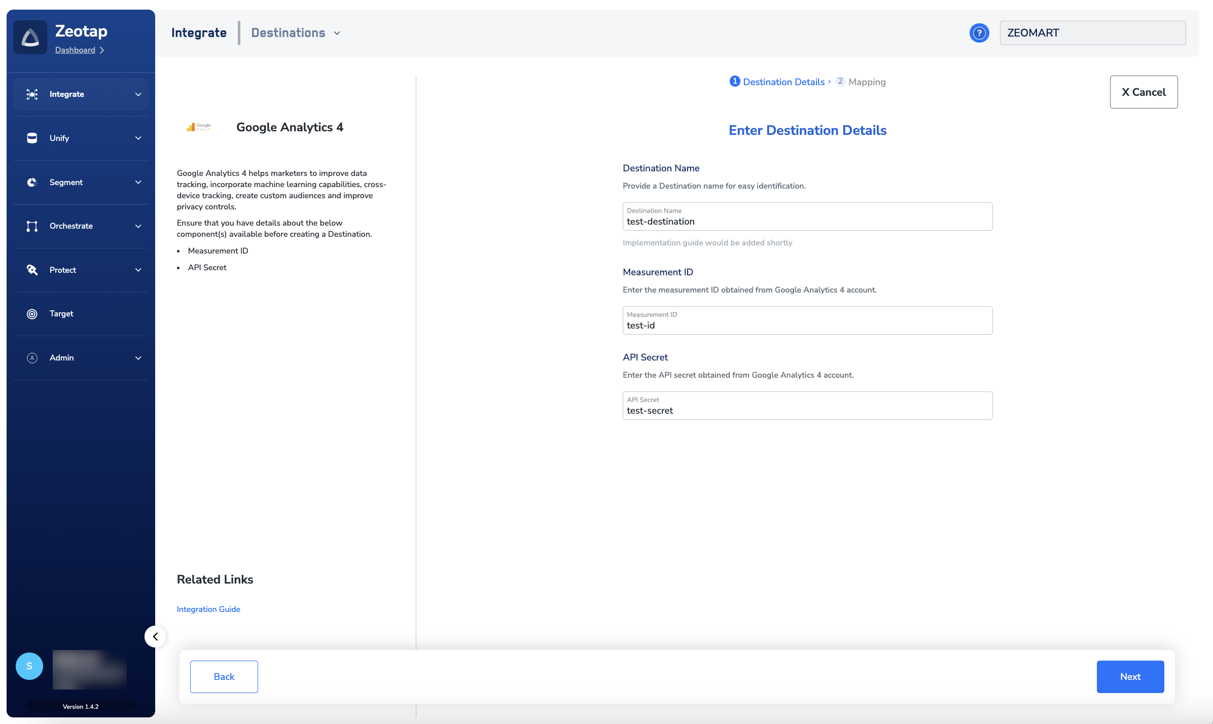 Perform the following steps to create a Destination for Google Analytics 4:Click Google Analytics 4. A screen appears displaying details about the particular destination towards the left. On the right-hand side of the screen find a list of fields that are required for the integration to be established. Enter the required details as mentioned in the following steps:a. Enter a name for the Destination.b. Enter the Measurement ID and API Secret that you obtained as mentioned above.c. Review all the values entered above and then click Next to proceed.