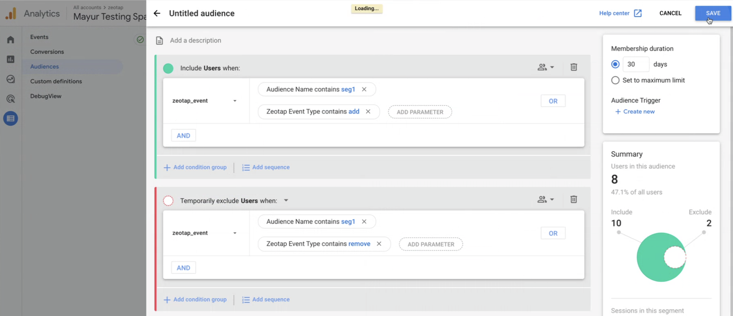 To exclude users that were subsequently removed from the audience, Click Add new condition and then make the following selections:a. Click Events and then choose zeotap_event from the drop-down menu.i. Audience Name > audience_name > choose the relevant audience name. The audience name automatically appears in the drop-down menu for audience_name.ii. Zeotap Event Type > zeotap_event_type > choose Remove for users being added to the segment.