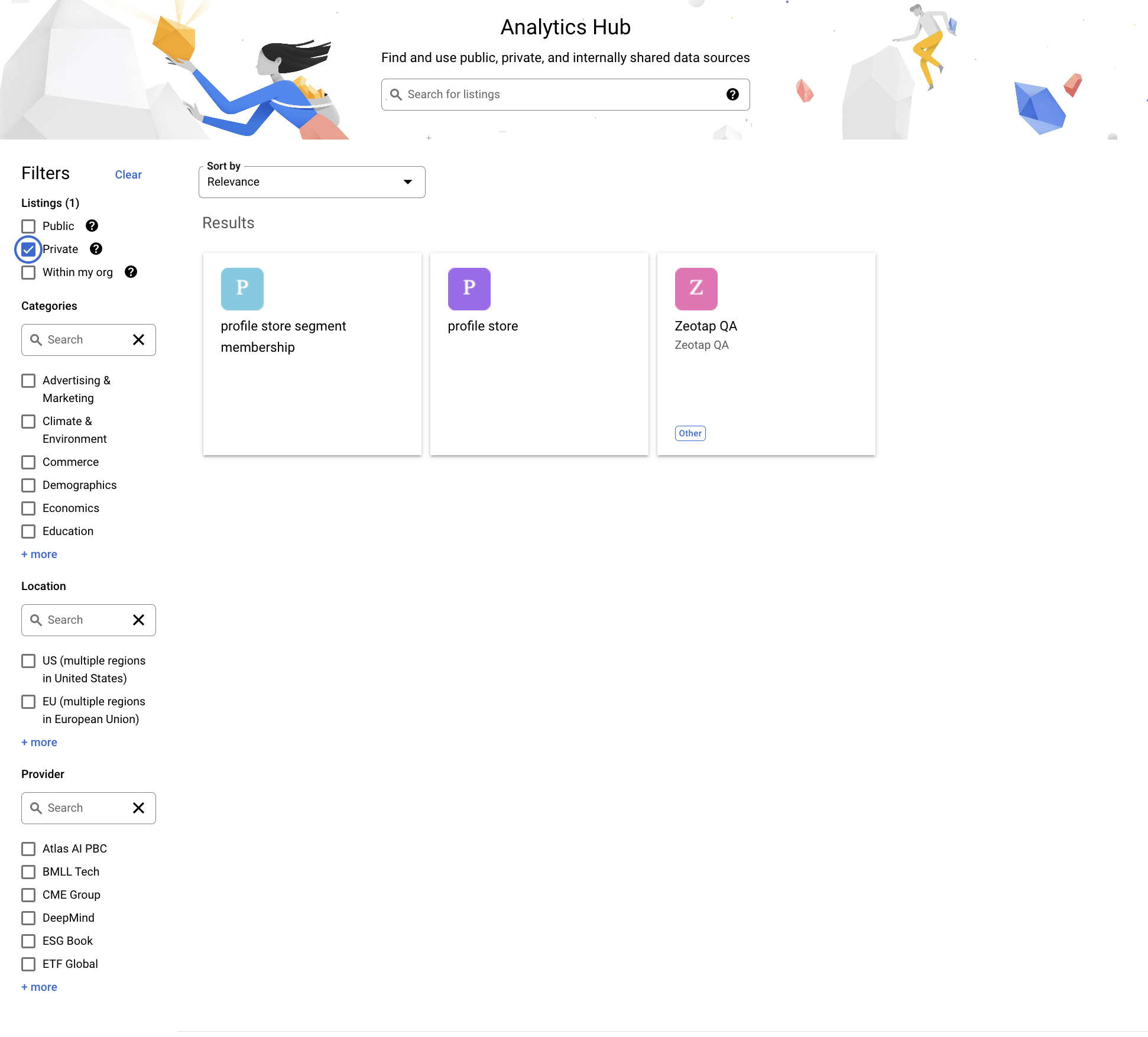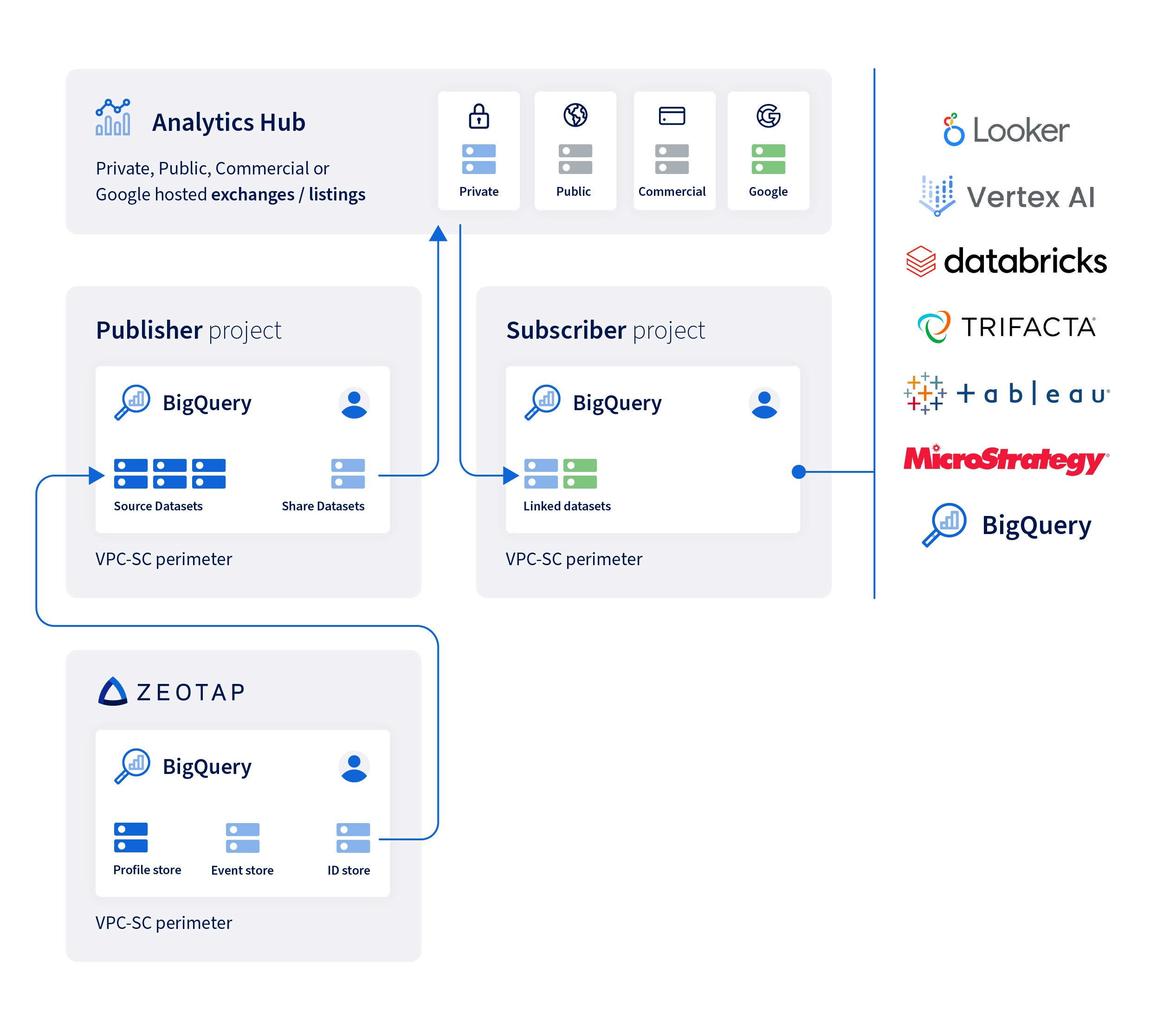 Your ingested customer data in Zeotap is unified, based on the identifiers shared and the id strategy set in your account. The unique customer profile that is created, involves linking identifiers from different data sources and devices in a way that is accurate, scalable and privacy compliant. For the integration to work between Zeotap and the Google Analytics Hub, Zeotap gives access for the Profile (Profile + ID) store hosted in Zeotap’s Google BigQuery account to your service accounts. Note that the Google Analytics Hub uses a Publisher-Subscriber model to distribute data at scale. As the core element of this model, Zeotap publishes the dataset privately on the Google Analytics hub, to which you can subscribe. The shared dataset is the Profile store hosted in Zeotap’s Google BigQuery account to which Zeotap has granted you access. You get access to the profile, consent, ids and campaign-related data. Once these steps are successfully executed, you can easily leverage this data through any other data warehouse you are using.Components of the integration