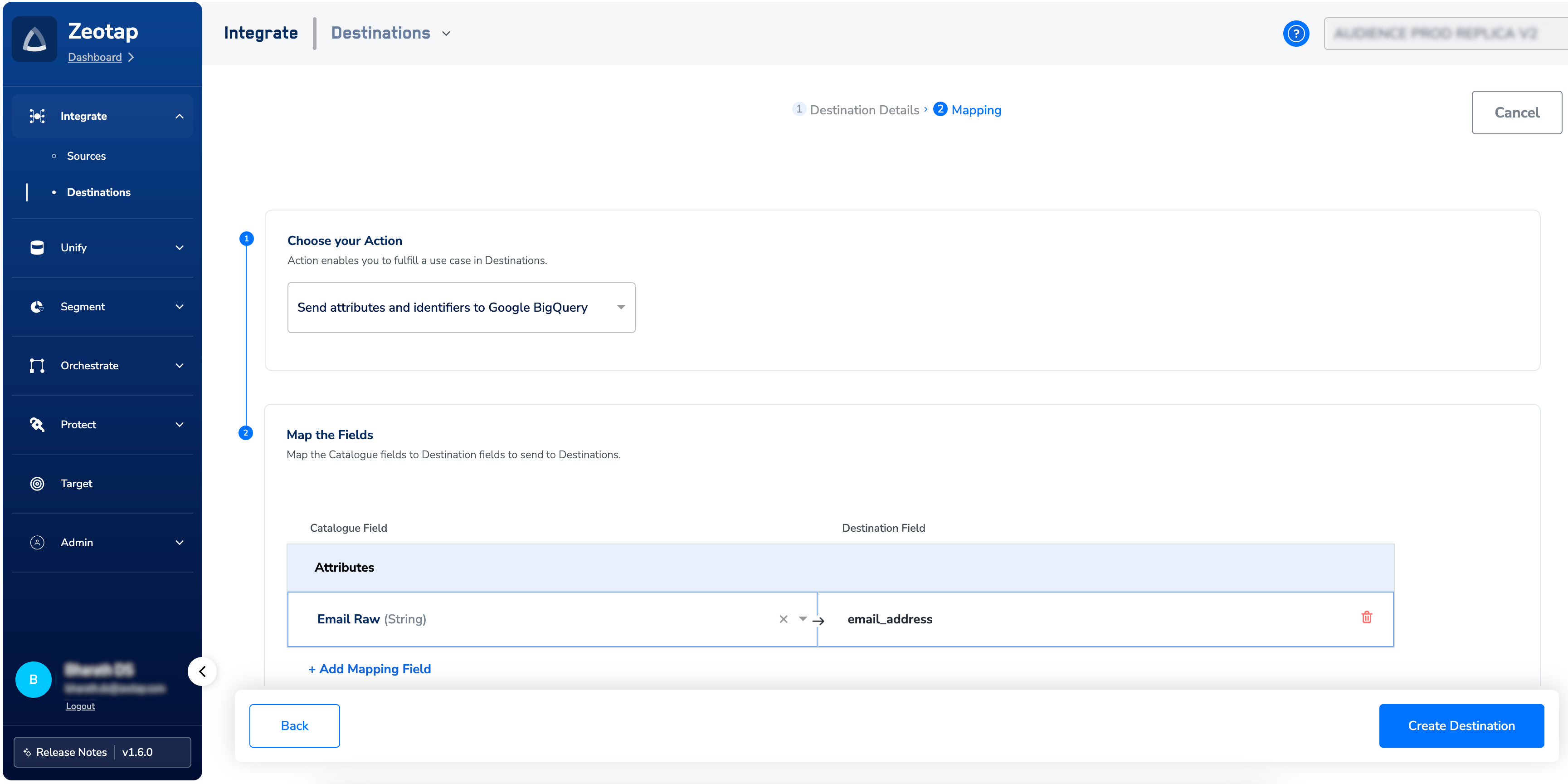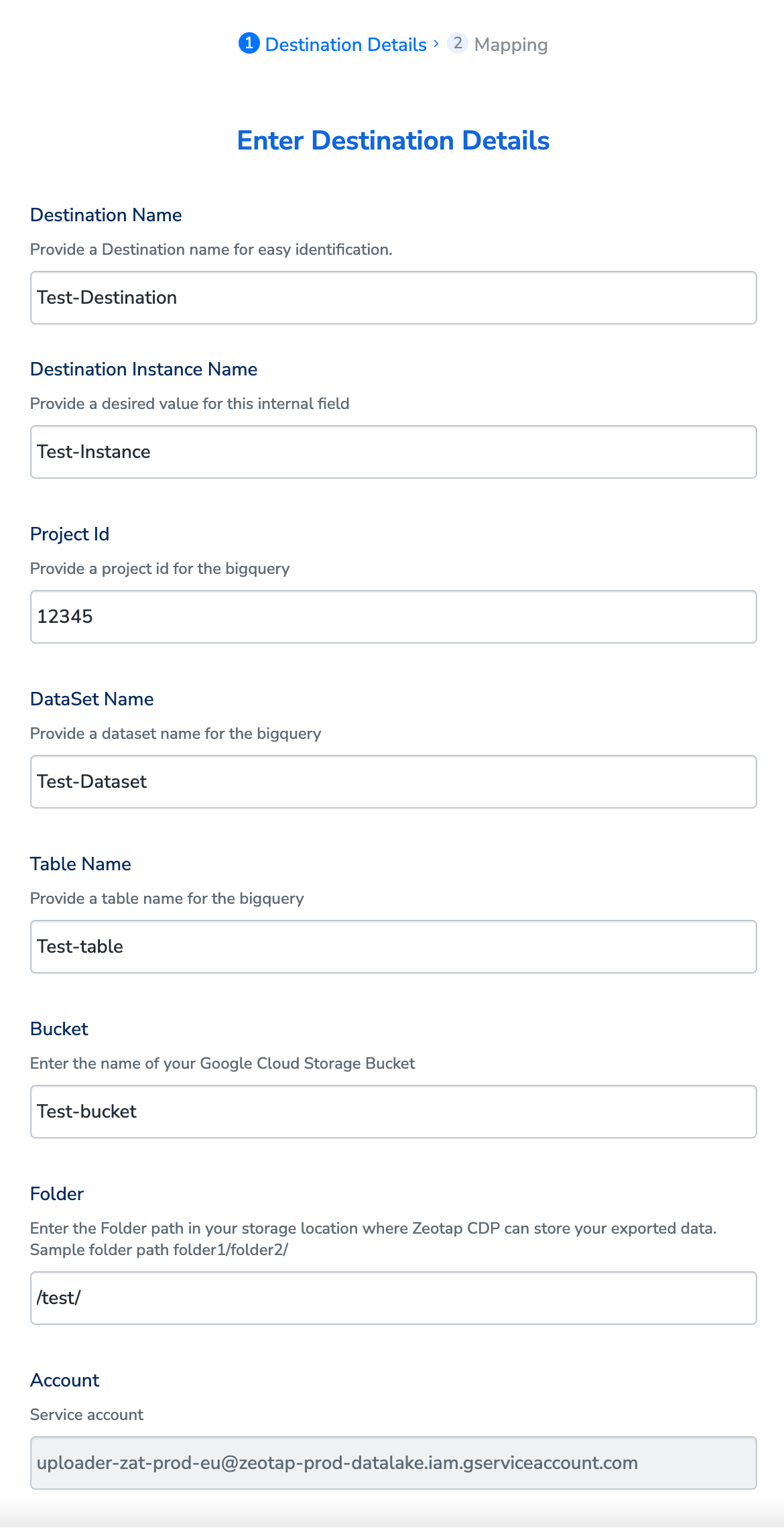 Perform the following steps to create a destination for Google BigQuery in Zeotap CDP:Click Google BigQuery. A screen appears displaying details about the particular destination towards the left. On the right-hand side of the screen find a list of fields that are required for the integration to be established. Enter the required details as mentioned in the following steps:a. Enter a descriptive name for the Destination.b. Provide the Destination Instance Name, which is an internal field for the destination.c. Enter the Project ID that differentiates your project from all others on Google Cloud. Learn mored. Under Dataset Name, provide the top-level container name used to organise and control access to your tables and views. Learn moree. Under Table Name, enter the table name that contains individual records organised in rows. Learn moref. In the Bucket field, provide the name of the Google Cloud Storage Bucket. Learn moreg. In the Folder field, provide the folder path in your storage location where Zeotap CDP can store your exported data. Learn moreh. Under Account, the Service Account associated with Google Cloud is displayed. Ensure that you provide the following necessary permissions on Google Cloud before sending data from Zeotap CDP:i. bigquery.tables.createii. bigquery.tables.getiii. bigquery.tables.updateDataiv. bigquery.tables.updatev. bigquery.jobs.createi. Review all the values entered above and then click Next to proceed to Actions and Mapping.