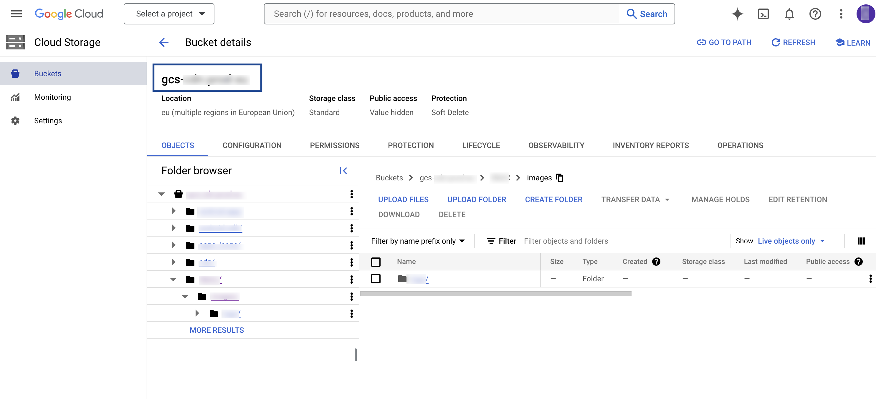 In Google Cloud Storage, a folder serves as a logical container for organising stored objects within a bucket. In reality, there are no actual folders in Google Cloud Storage. Instead, the folder concept is emulated by employing object key names containing slashes (”/”) to replicate a hierarchical arrangement. You can obtain this information from your Google Cloud Storage account as shown in the image below.