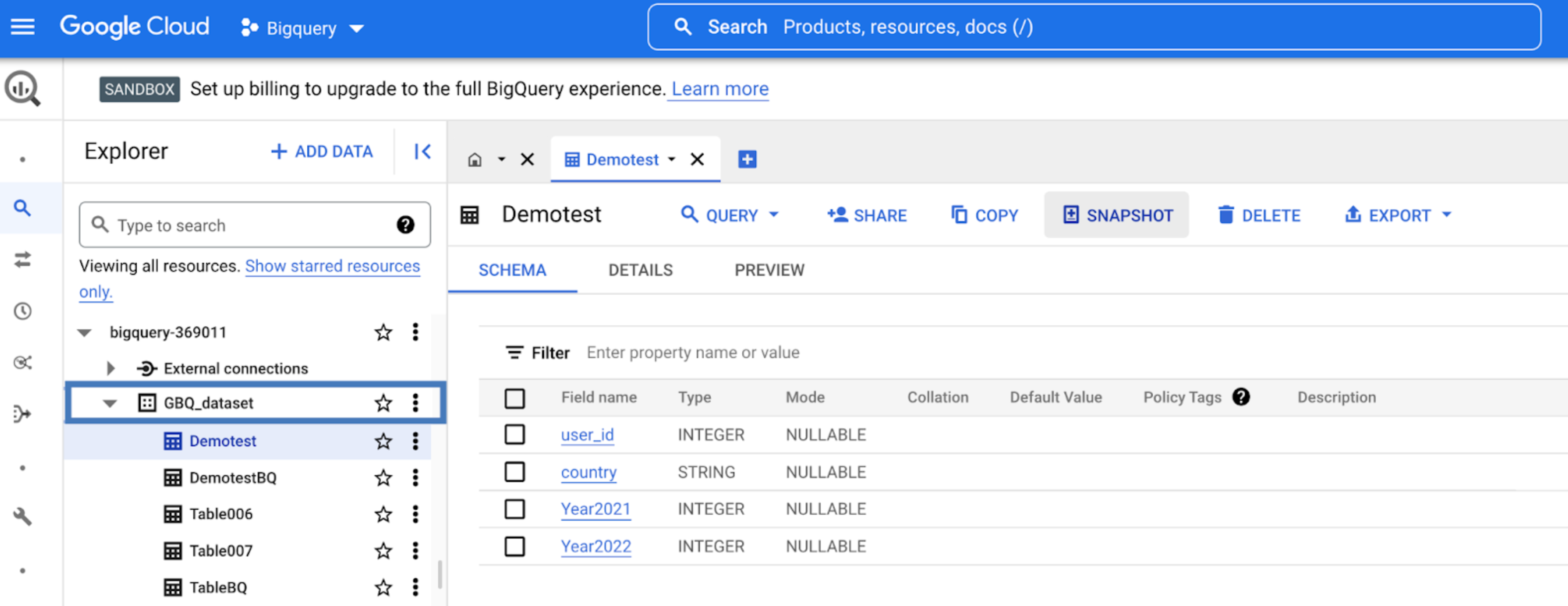 A BigQuery table contains individual records organised in rows. Each record is composed of columns/fields. Every table is defined by a schema that describes the column names, data types and other information. In the below example, the tables are Demotest, DemotestBQ, Table006, Table007 and TableBQ. Currently, we do not support tables with JSON column types. If a table exists, Zeotap uses it to send data. Otherwise, Zeotap creates a new folder and sends the data.