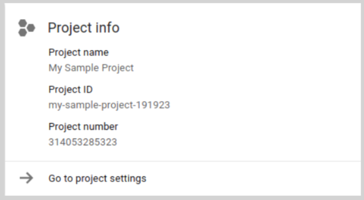 A Project ID is a unique string that differentiates your project from all others on Google Cloud. You can use the Google Cloud console to generate a Project ID. You can find the Project ID in the Google Cloud console - Dashboard page. In the below example, the Project name is My Sample Project and the Project ID is my-sample-project-191923.