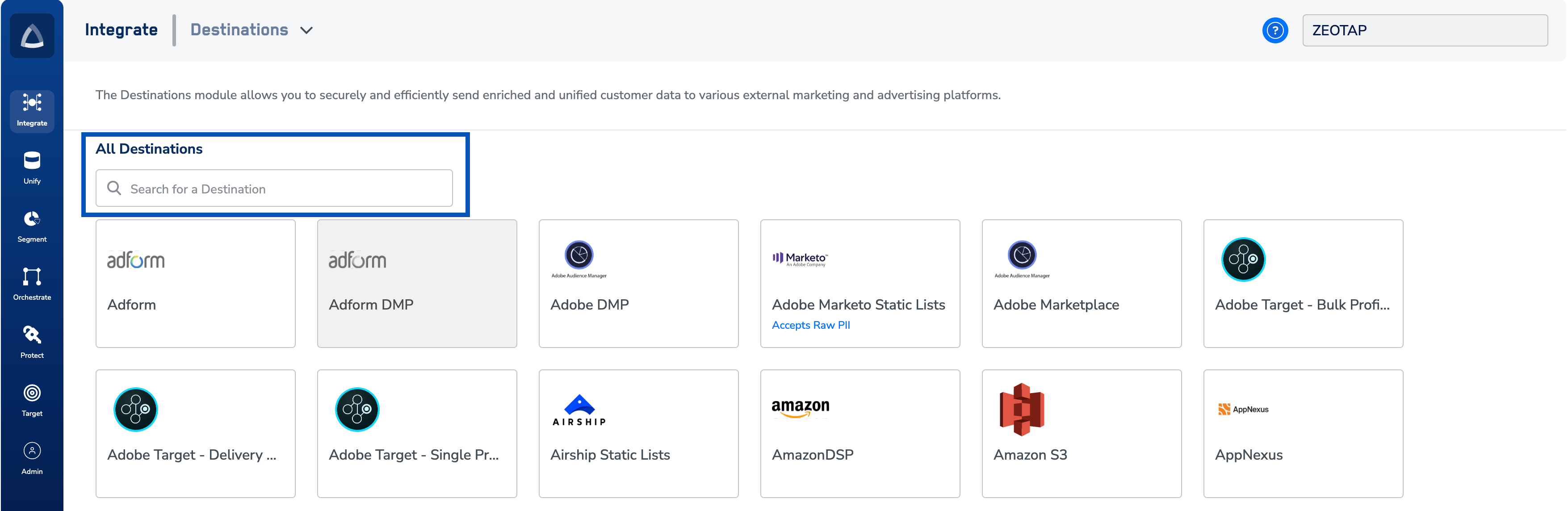 In the new screen that appears, choose the appropriate Action and mapping as explained below.a. Choose the desired action under Choose your Action and then choose the corresponding identifiers under Map the Fields. By default, the Output Identifiers that are accepted by the platform such as, MAIDs, Cookies, email Ids and more are displayed. However, you can edit, add or remove an identifier from the list. To do so, refer here.b. Click Create Destination. The created Destination gets listed in the Target and Audiences applications, which can be linked to an Audience/segment.