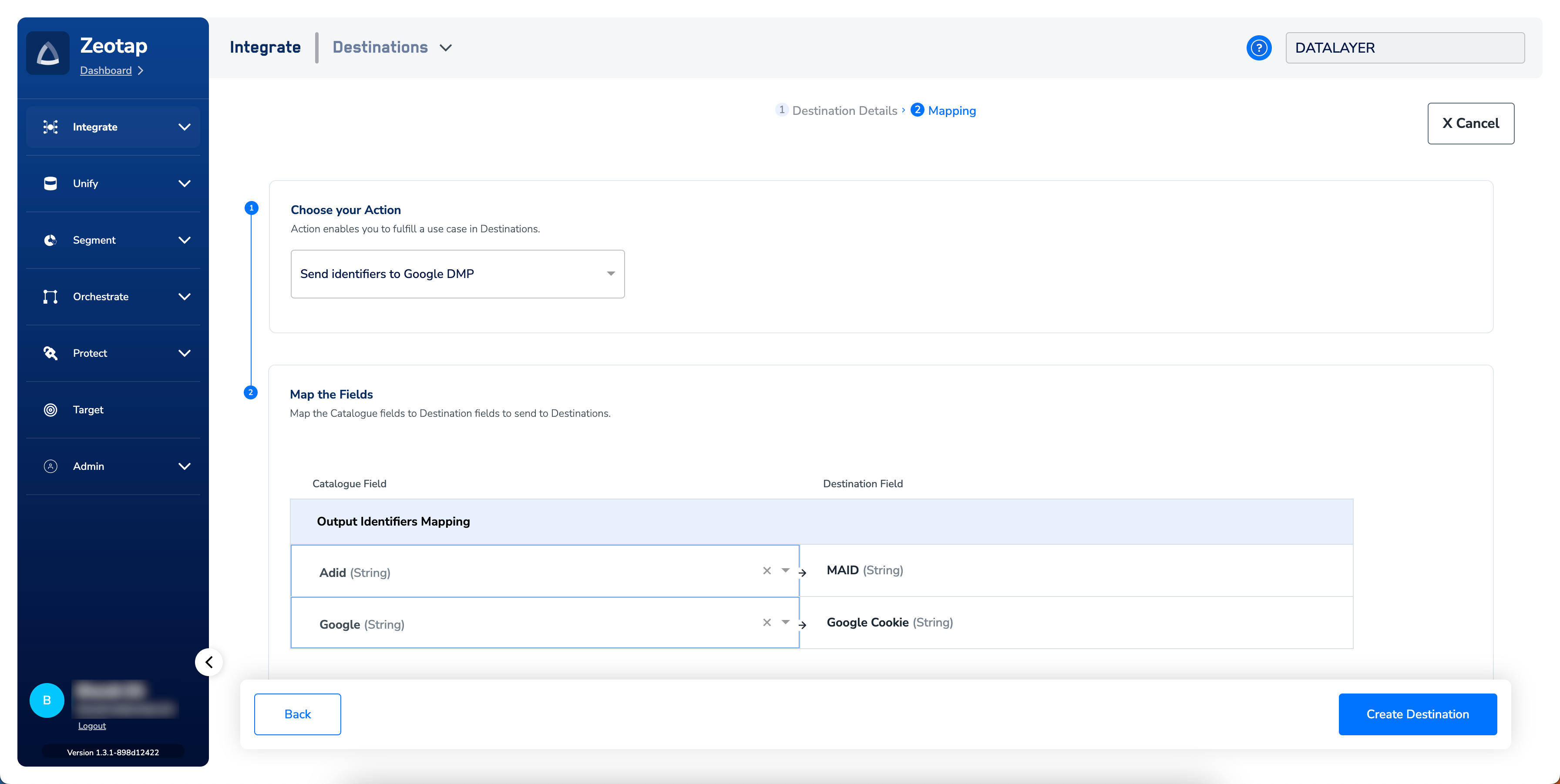 In the new screen that appears, choose the appropriate Action and mapping as explained below.a. Choose the desired action under Choose your Action and then choose the corresponding identifiers under Map the Fields. By default, the Output Identifiers that are accepted by the platform such as, MAIDs and Cookies are displayed. However, you can edit, add or remove an identifier from the list. To do so, refer here.b. Click Create Destination. The created Destination gets listed in the Target, Connect and Audiences applications, which can be linked to an Audience/segment.