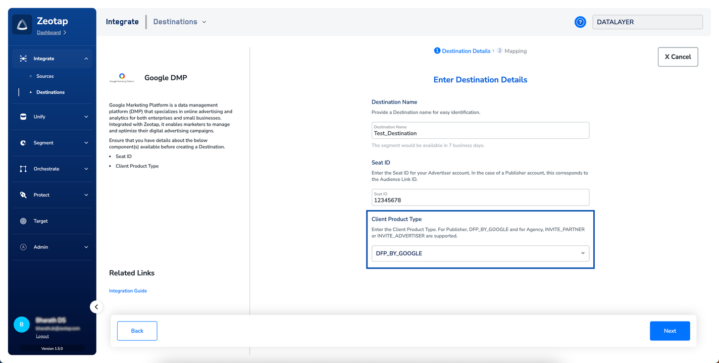Perform the following steps to create a Destination for Google DMP:Click Google DMP. A screen appears displaying details about the particular destination towards the left. On the right-hand side of the screen find a list of fields that are required for the integration to be established. Enter the required details as mentioned in the following steps:a. Enter a name for the Destination.b. Enter the Seat ID. This is the ID for your Advertiser account. You can find it next to your account name. However, in the case of a Publisher account, this is the Audience Link ID.c. Under Client Product Type, choose one of the following options based on the type of connection that you wish to set up:i. Choose DFP_BY_GOOGLE to set up a Google Ad Manager connection.ii. Choose either INVITE_PARTNER or INVITE_ADVERTISER to set up a DV 360 connection as per your need.d. Review all the values entered above and then click Next to proceed.