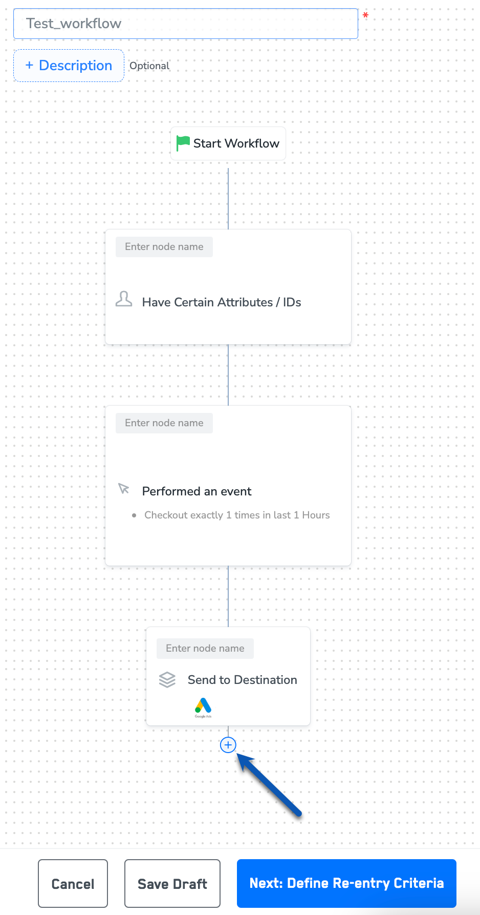 After adding conditions and filters for users, choose one of the following options:a. Save Draft: Enables you to revisit and edit the workflow before publishing.b. Next: Re-entry Condition: Determines whether a user can re-enter the same workflow.