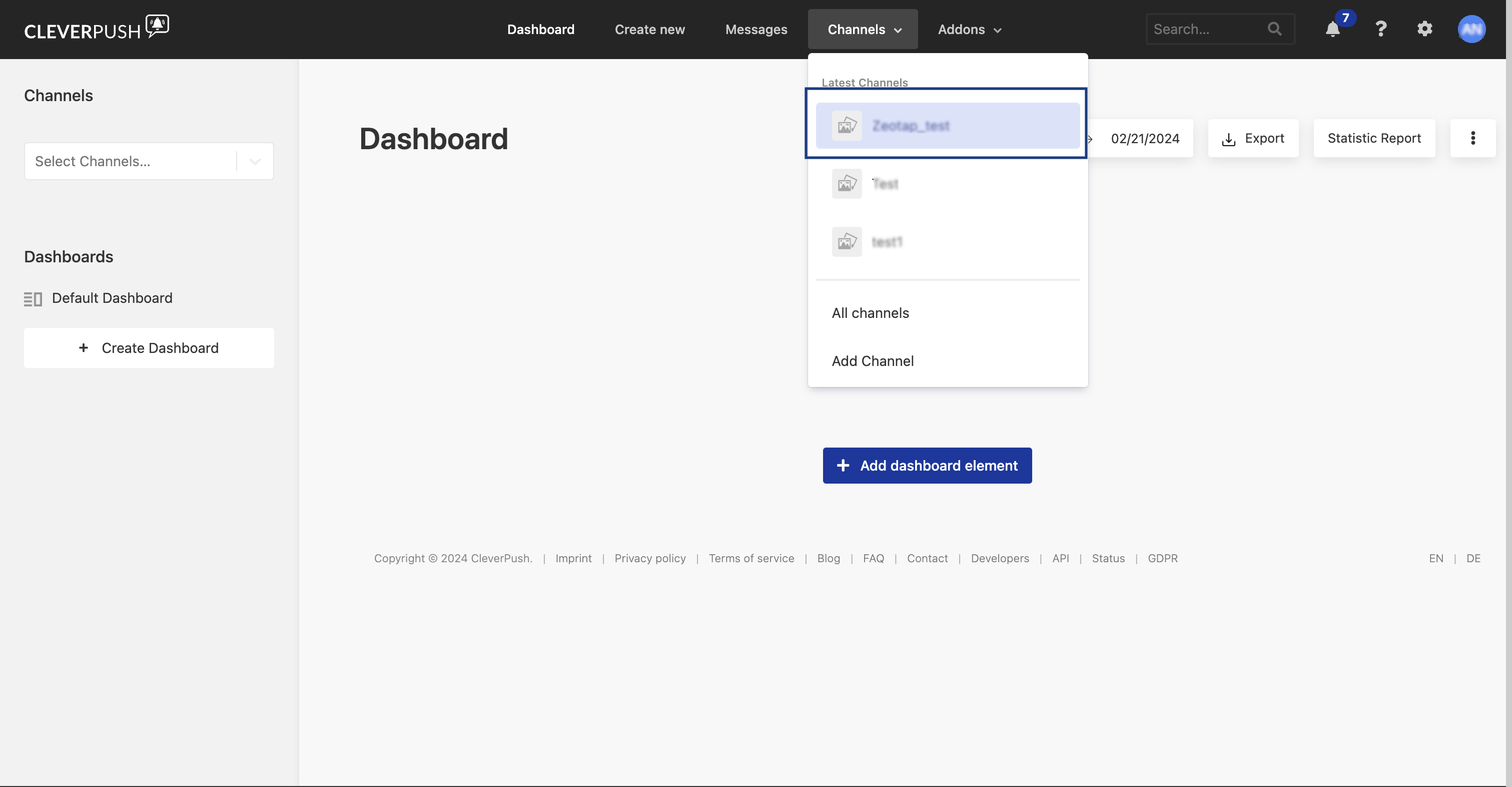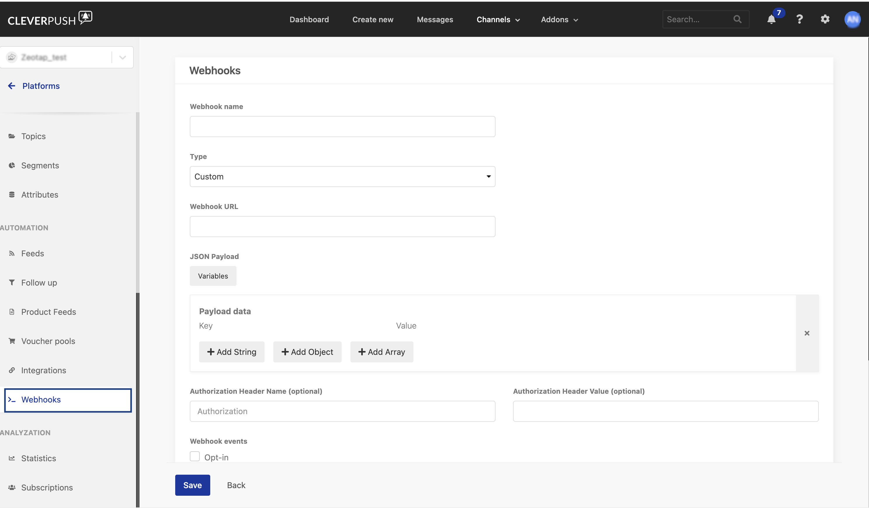This section provides information about how to establish a real-time connection between Cleverpush and Zeotap using Zeotap’s endpoint through a Webhook connection. In addition, you can select the events that you want to ingest. Perform the following steps to configure the real-time data in Cleverpush:Select the channel you have created from the Channels dropdown. For more information about how to create a new channel in Cleverpush, refer here.