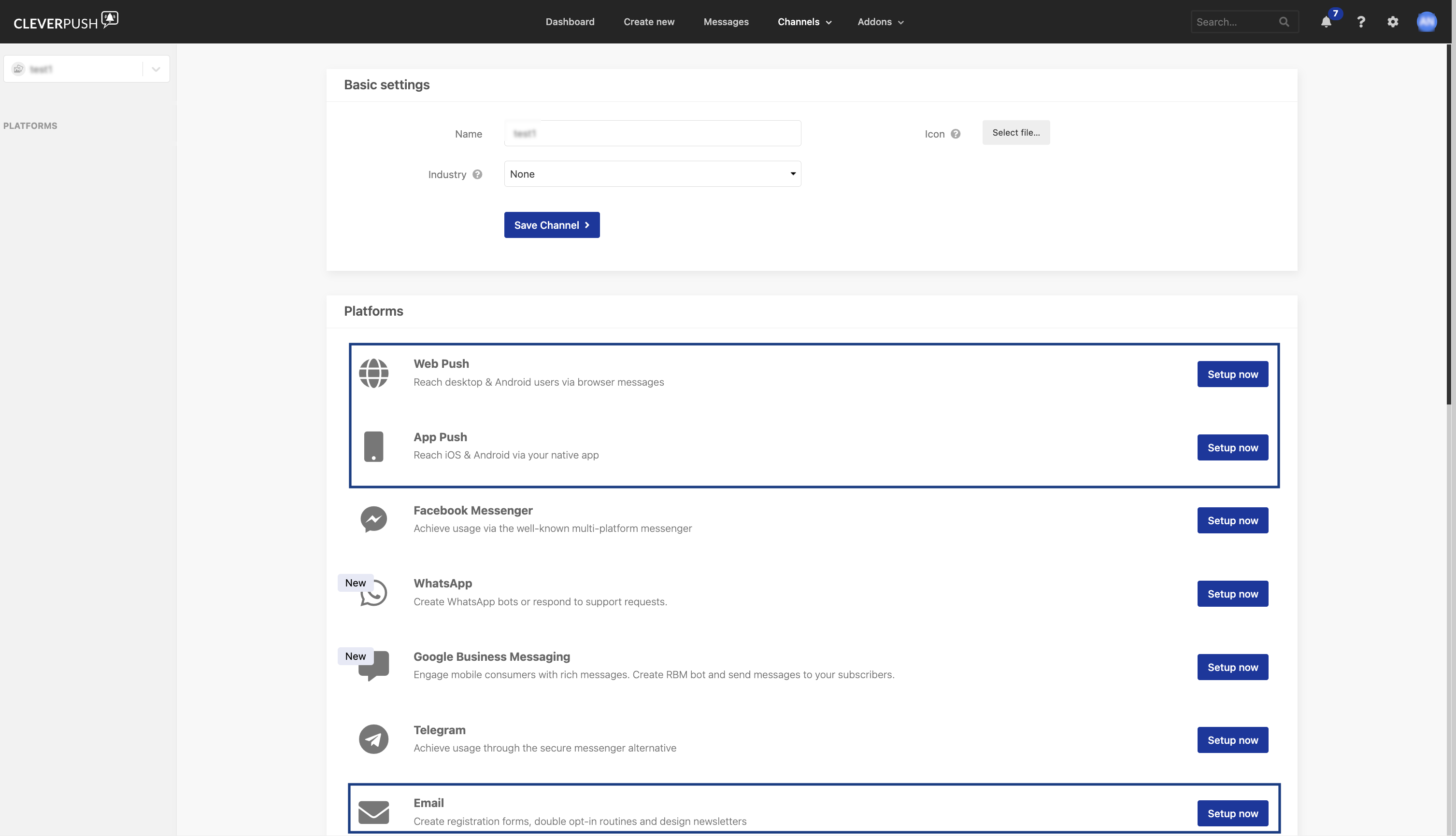 Under the channel you have created, setup the platforms for which you need the notifications to be pushed. Note that Zeotap CDP supports Web Push, App Push and Email Push. For more information about how to setup Web Push, App Push and Email Push platforms, refer here.