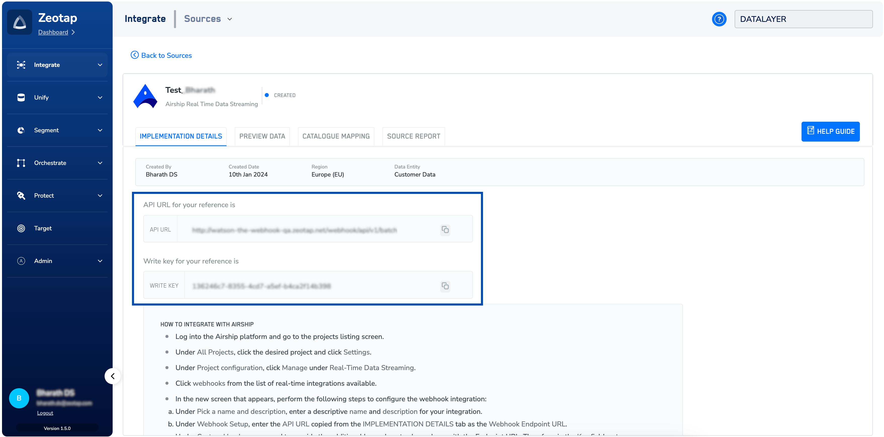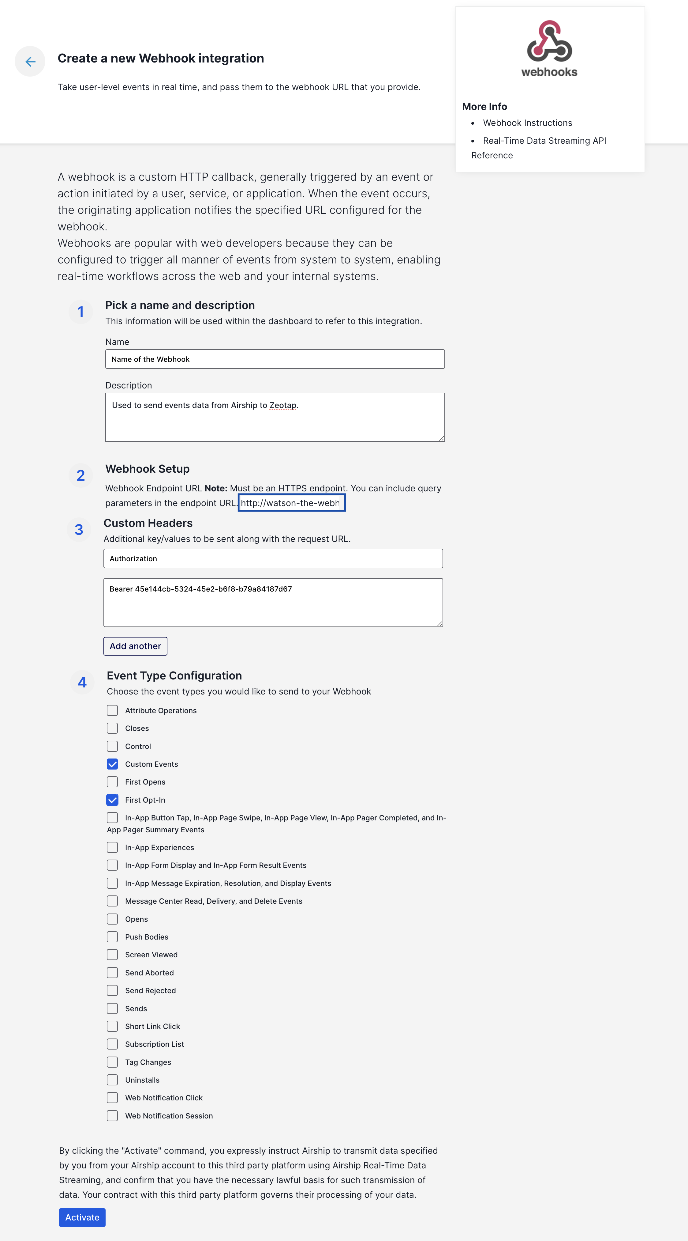 Bearer<space><write_key>. For example, Bearer 136246c7-8355-4cd7-a5ef-b4ca2f14b398d. Under Event Type Configuration, select the desired event types that you want to send to your webhook integration and click Activate. With the streaming connection established between Airship and Zeotap, you can start sending the events to Zeotap.