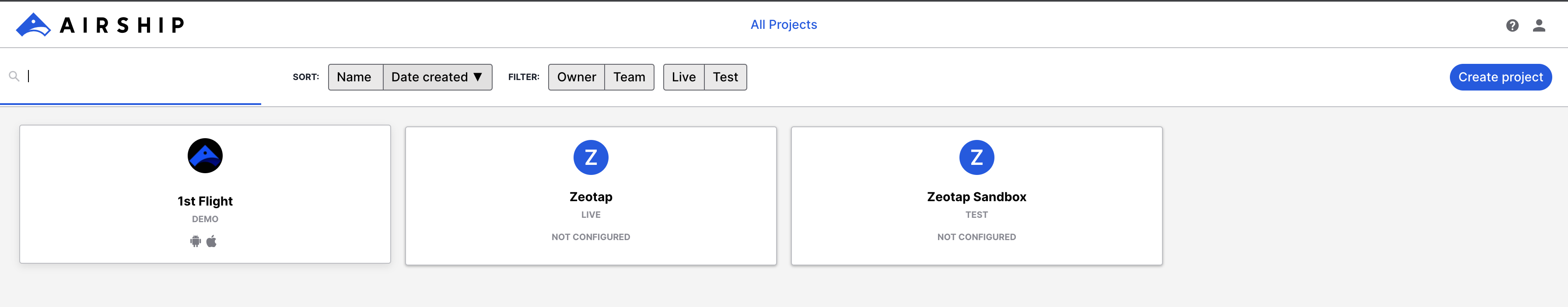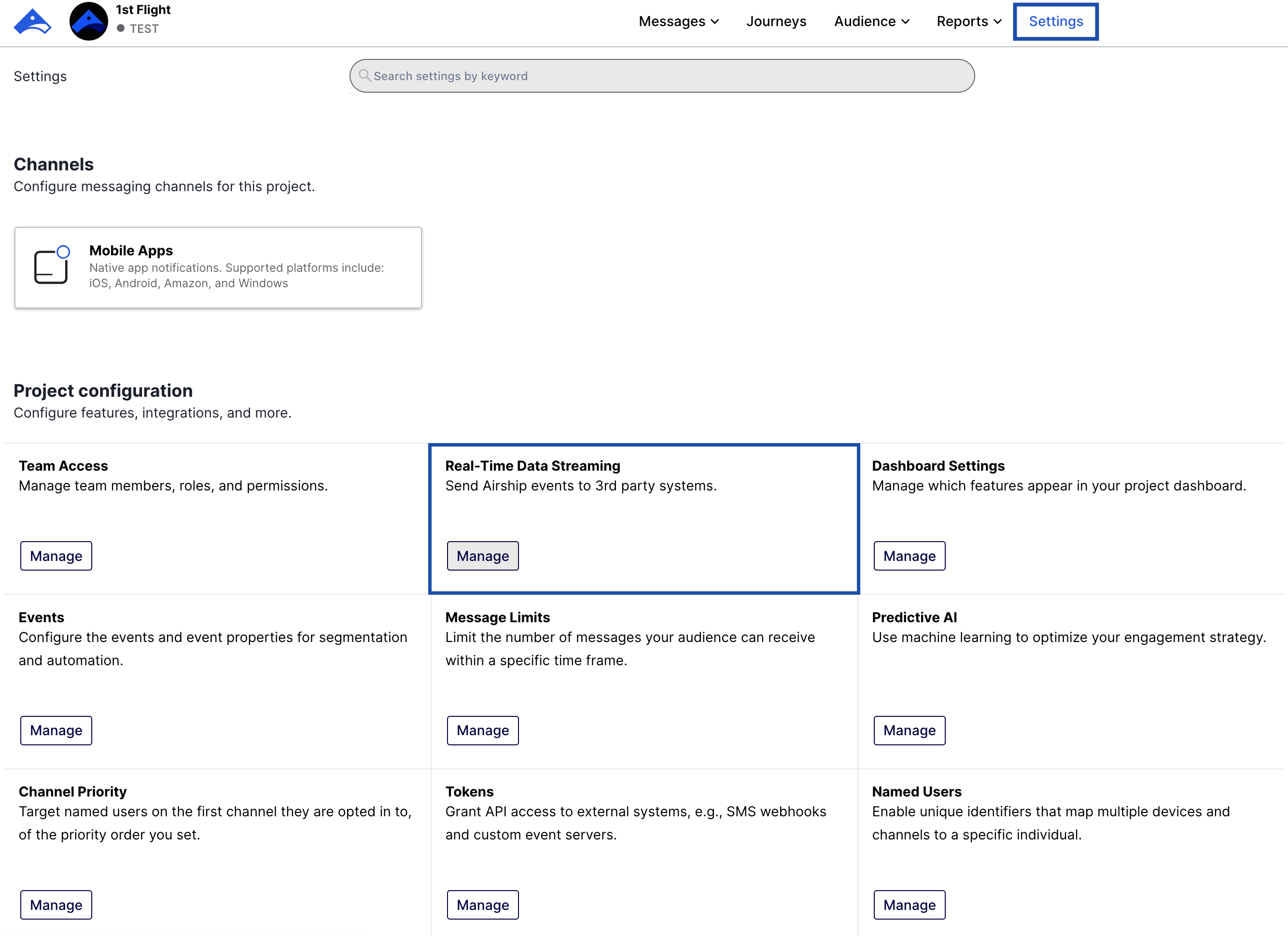 This section provides information about how to establish a streaming connection between Airship and Zeotap using the Zeotap’s endpoint through a Webhook connection. In addition, you can select the events that you want to ingest. Perform the following steps to configure the streaming data in Airship:Under Project configuration, click Manage under Real-Time Data Streaming as shown in the image below.