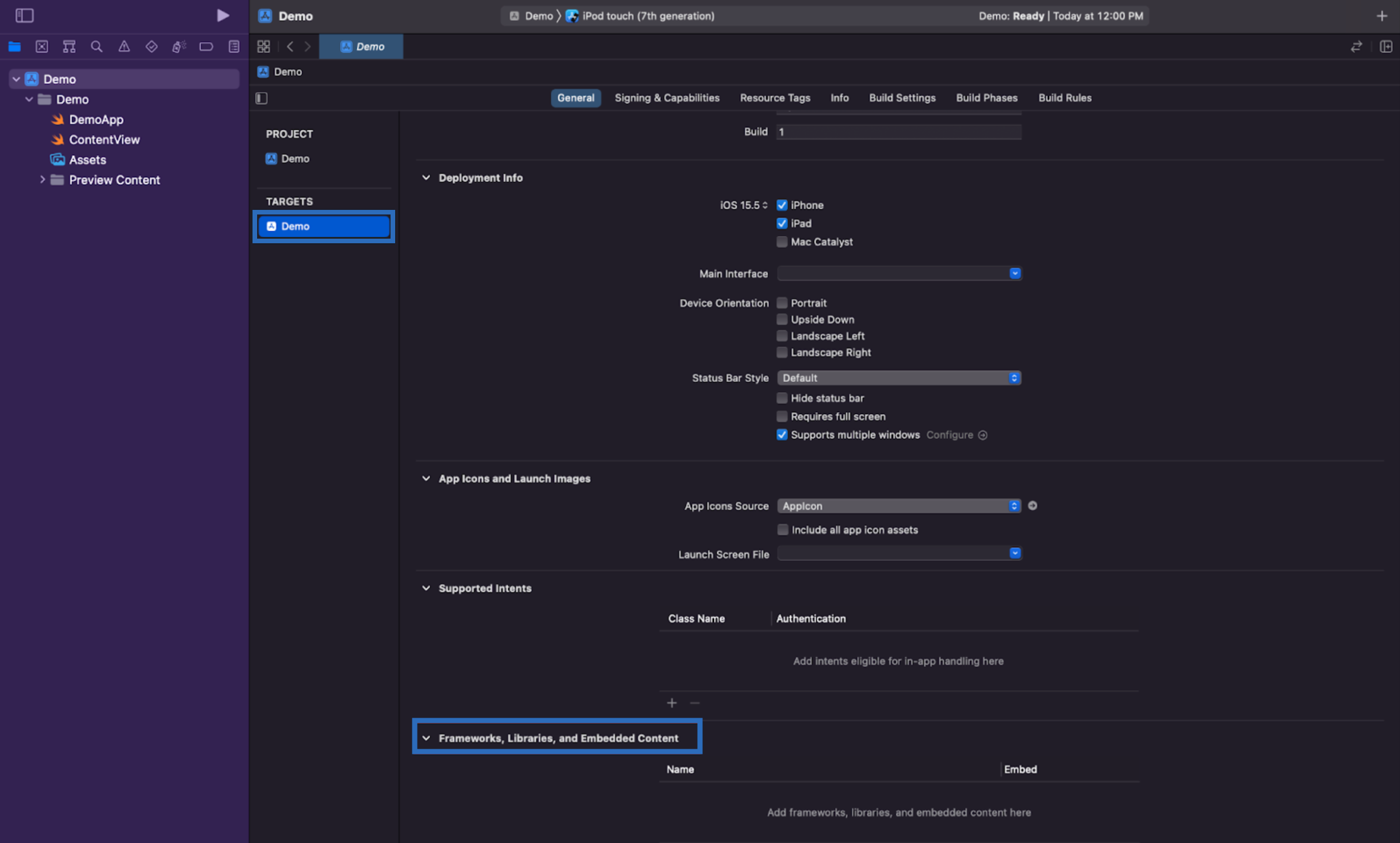 To launch the project settings, click the project in the navigation bar and select as follows: PROJECT → TARGET → General → scroll and find Frameworks, Libraries and Embedded Content.