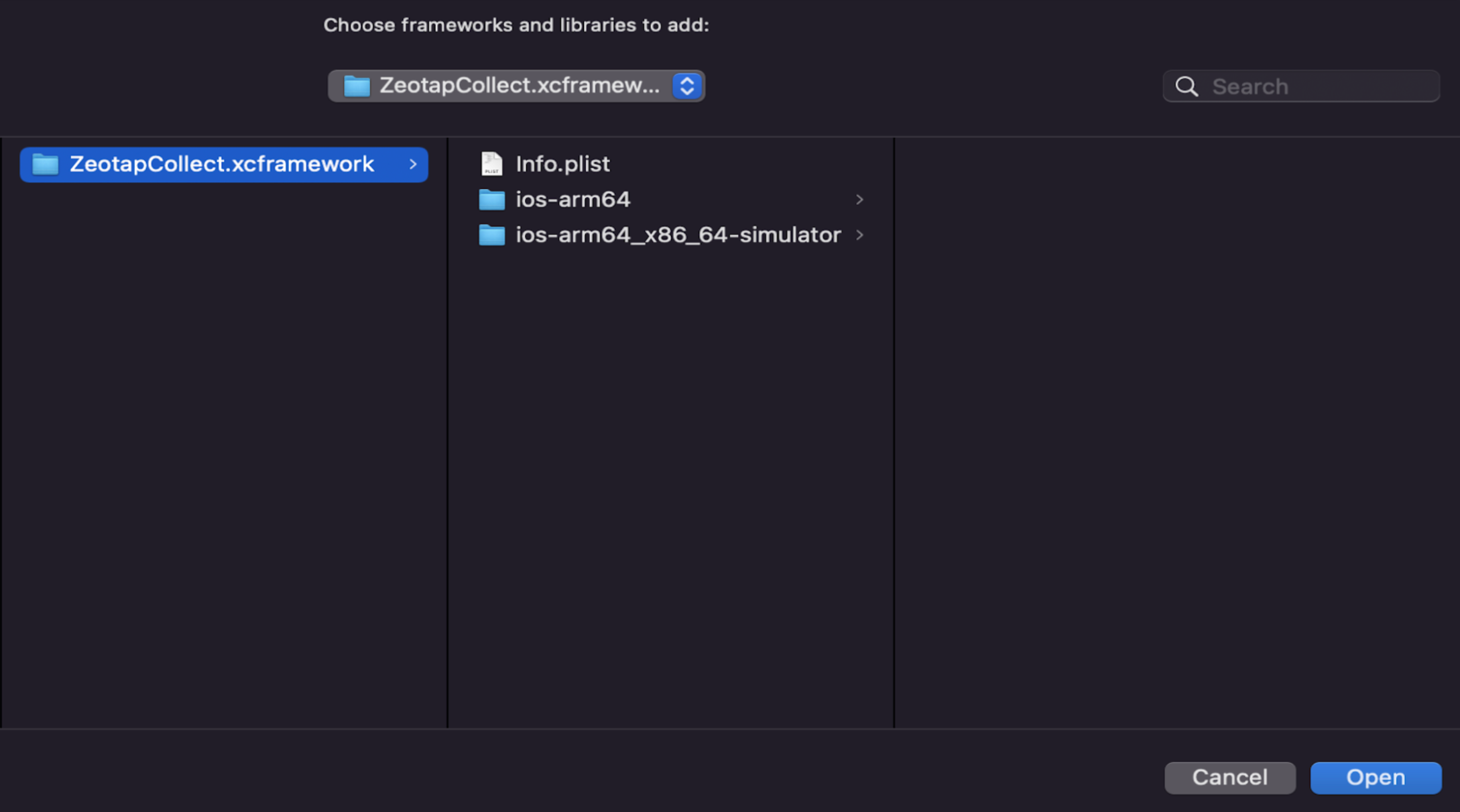 xcframework to the project.a. Select the ZeotapCollect.xcframework from downloads to integrate the Zeotap SDK.b. As you click to open, xcframework gets added to the project under Frameworks, Libraries and Embedded Content.