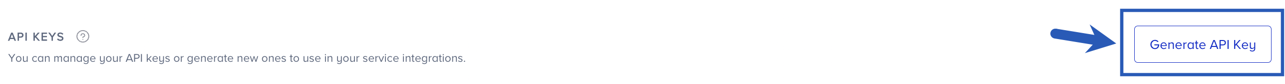 Perform the following steps to generate an API Key:Scroll to the API Keys section and click Generate API Key.If you have existing API keys, they appear in this section.