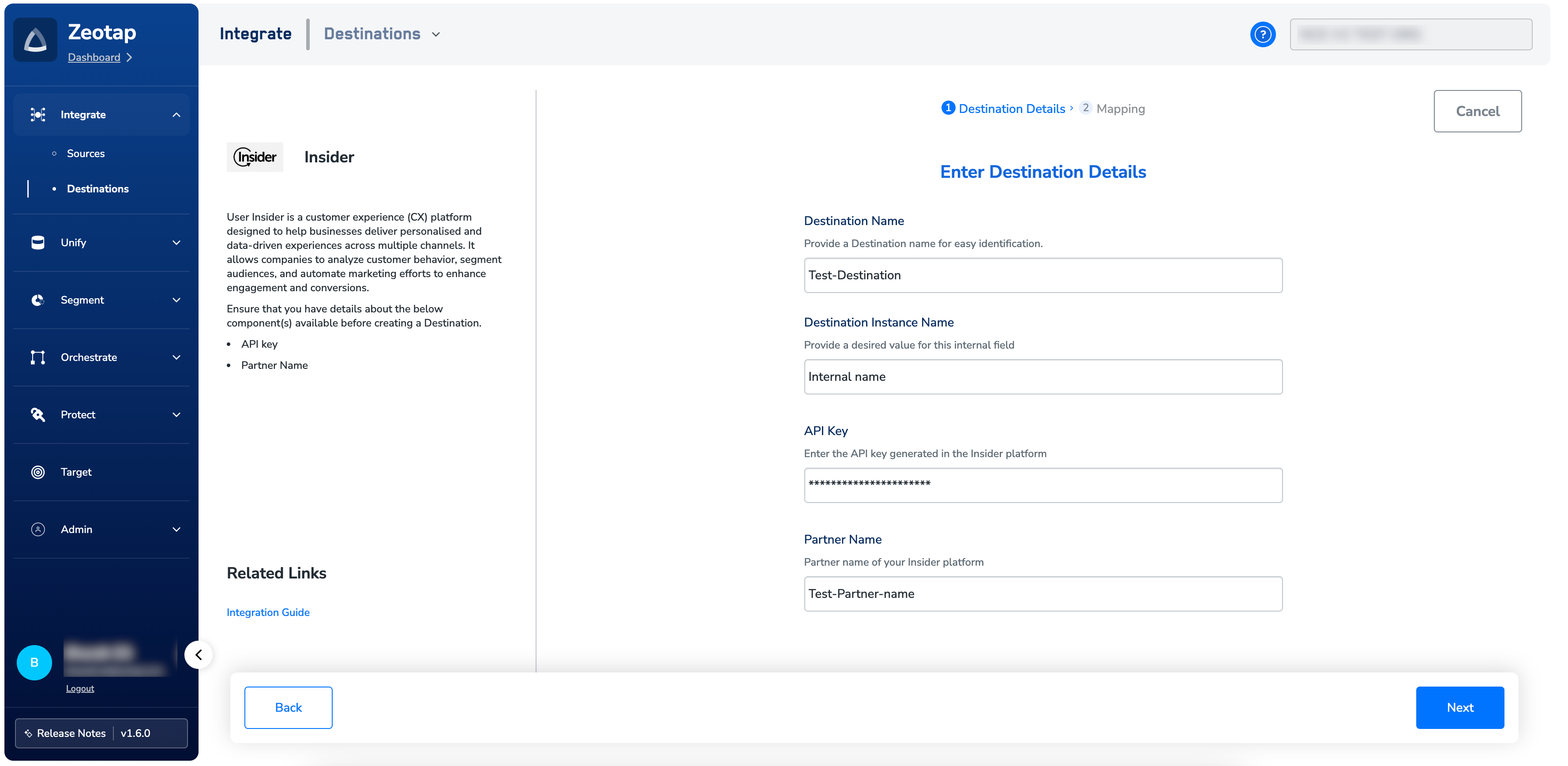 Follow these steps to create a destination for Insider:Click Insider. A screen appears displaying details about the destination on the left and required integration fields on the right. Enter the following details: