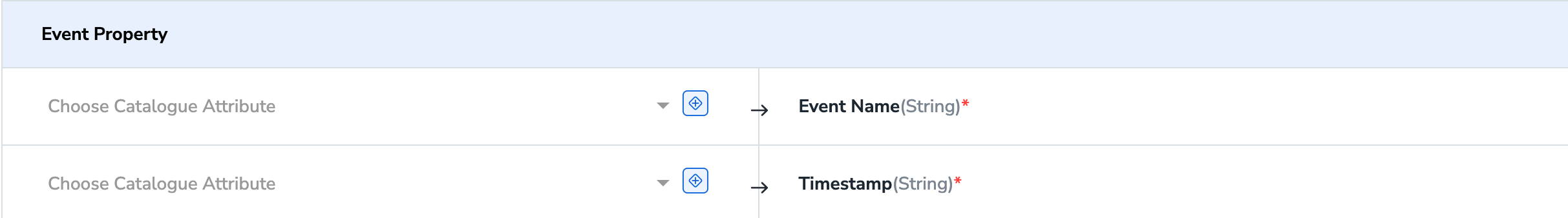 Under Map the Fields, for each Journey action, the system populates a list of identifiers and attributes. Ensure to map Catalogue fields and Destination fields appropriately. Required fields:- You must mandatorily map the Event Name and Timestamp fields for all events.