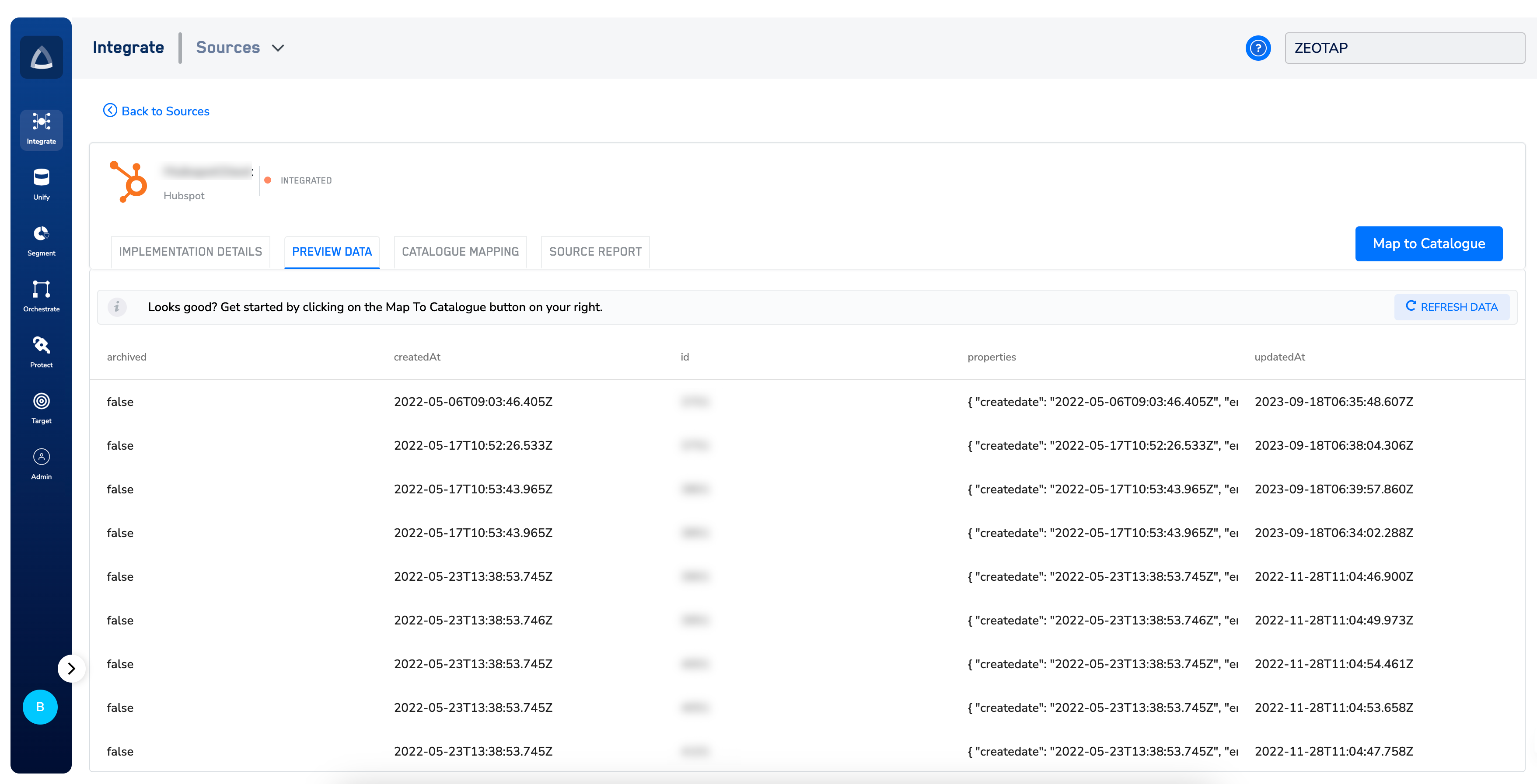Note:You can only map a source that has moved to the Integrated state. Once the mapping is successfully done, then the Source transitions to Mapped state. Post this state, the file/data dropped against this sources will be resolved and ingested into your Zeotap system.
