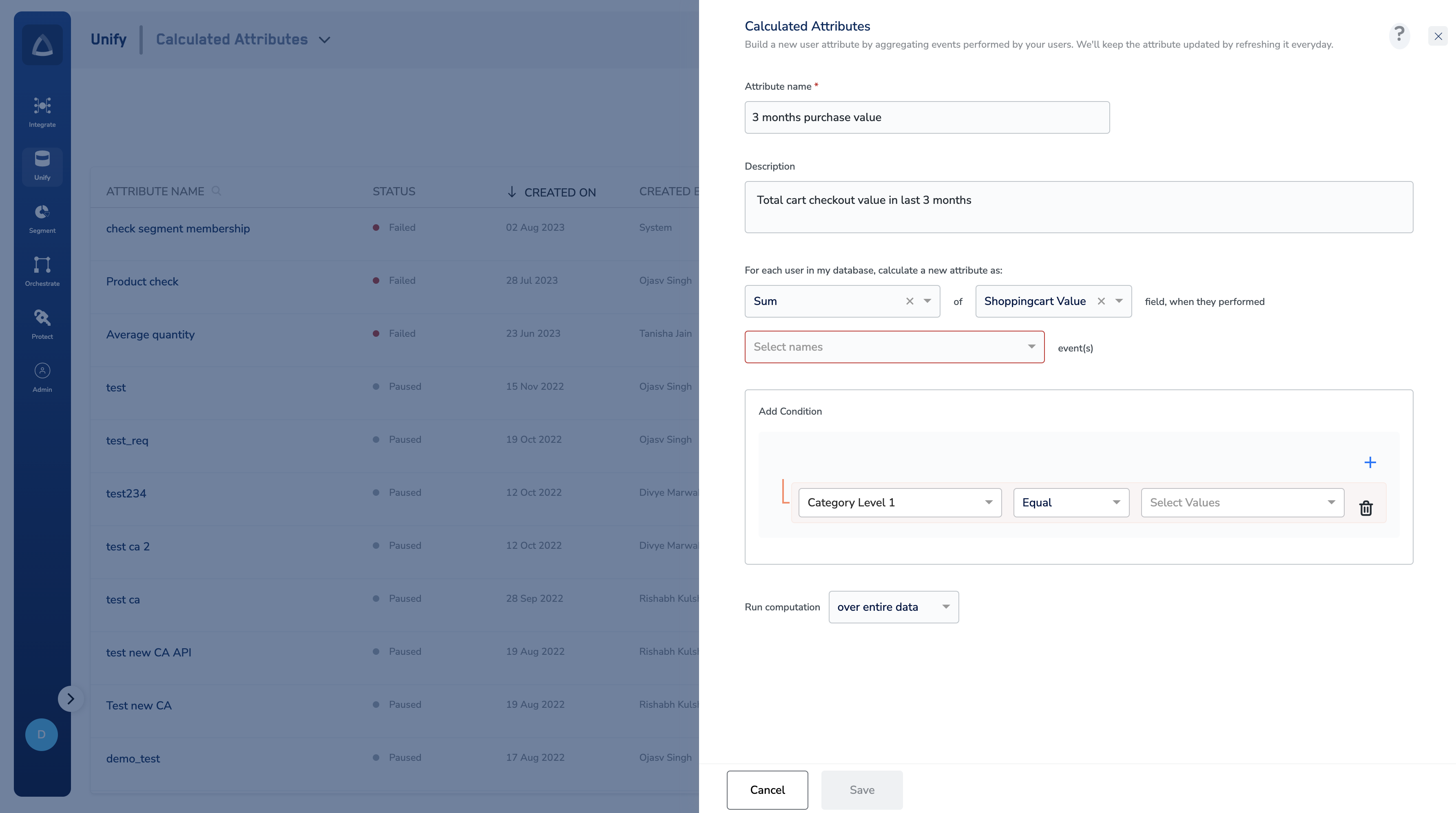 This step allows you to derive user-level insights by aggregating your users’ isolated actions. You can then use this data to create more powerful customer cohorts.As a marketer, you can use calculated attributes to create new attributes for a user by aggregating their event data over a specific time period. For example,
