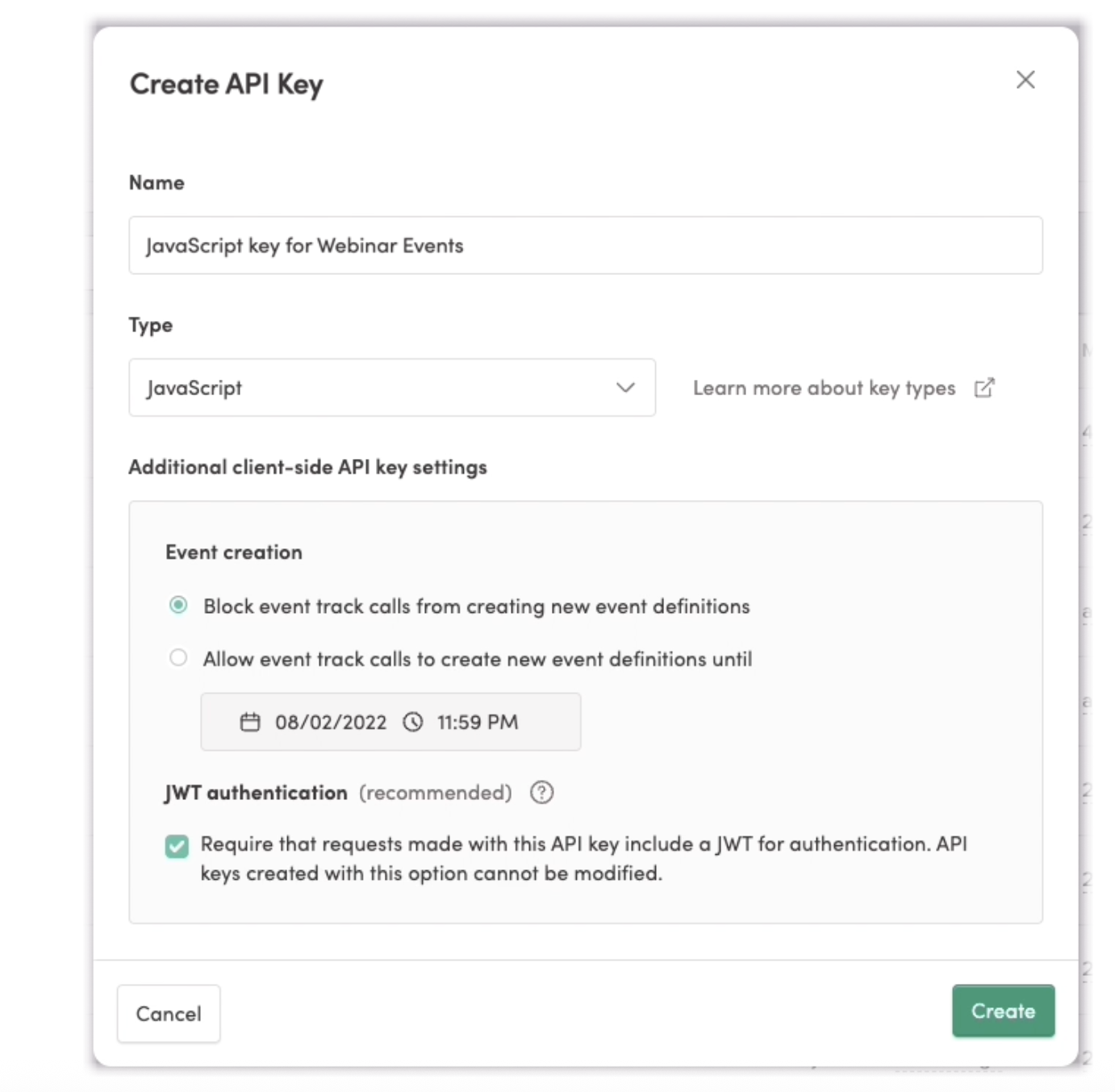 (Client-side only) If you have selected a client-side key type, you will see additional settings:a. Event Creation - Block creation of new event definitions, or allow them for up to 14 days in the future. For more information on this setting, see Event creation above.b. JWT Authentication - this is selected by default and highly recommended. To learn more about why this is encouraged, see JWT authentication above.