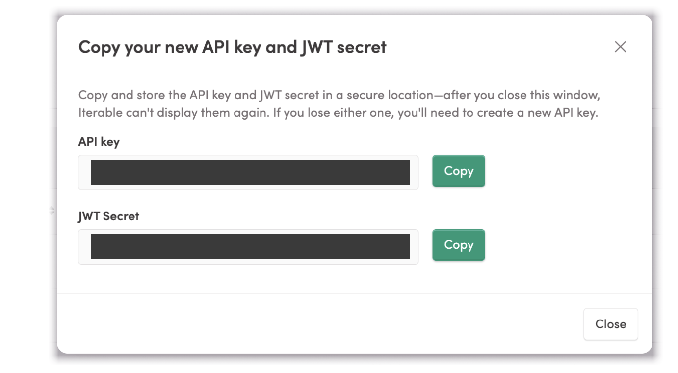 Store the values displayed on this screen in a secure location. After you close the window, Iterable cannot display them again. If you lose them, you’ll need to create a new API key.