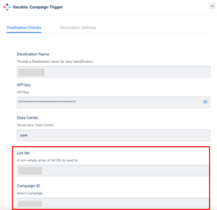 Under the Destination Settings tab, choose the List ID (String, we don’t support multiple list ID’s as of now), Campaign ID (String) and allow repeat marketing sends (true/false) as per your requirement.