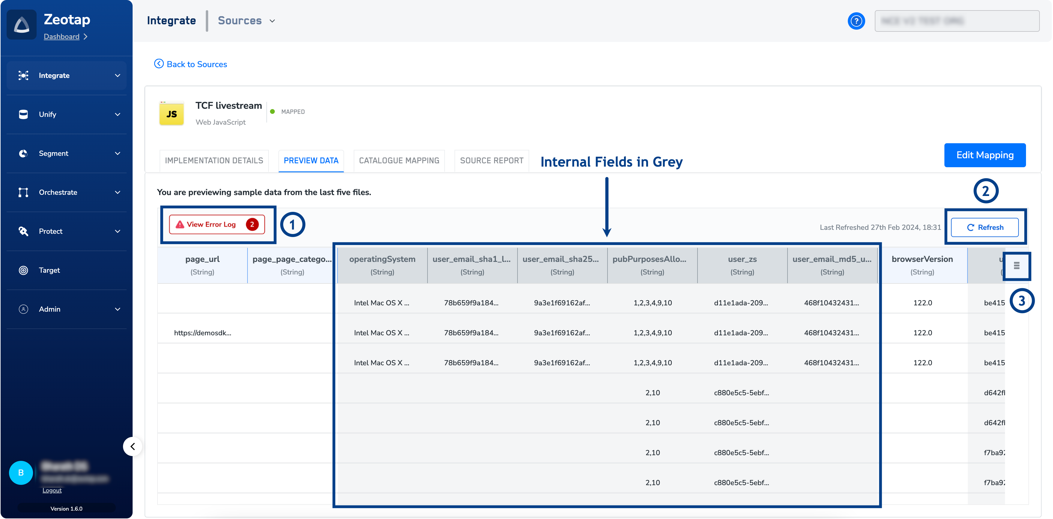Note:If no preview is available, then an error message is displayed stating the reason. You can try to fix the issue and try again after some time. In addition, ensure that the source is implemented correctly. In case you need further assistance, reach out to our support team at “support@zeotap.com”.