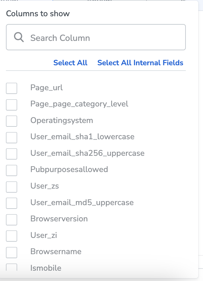 | 3 | Column Filters | This option allows you to conveniently filter and view specific columns in the given preview. Use appropriate options to select All fields, select all the internal fields, clear the selections and more as per your requirement.![]() |