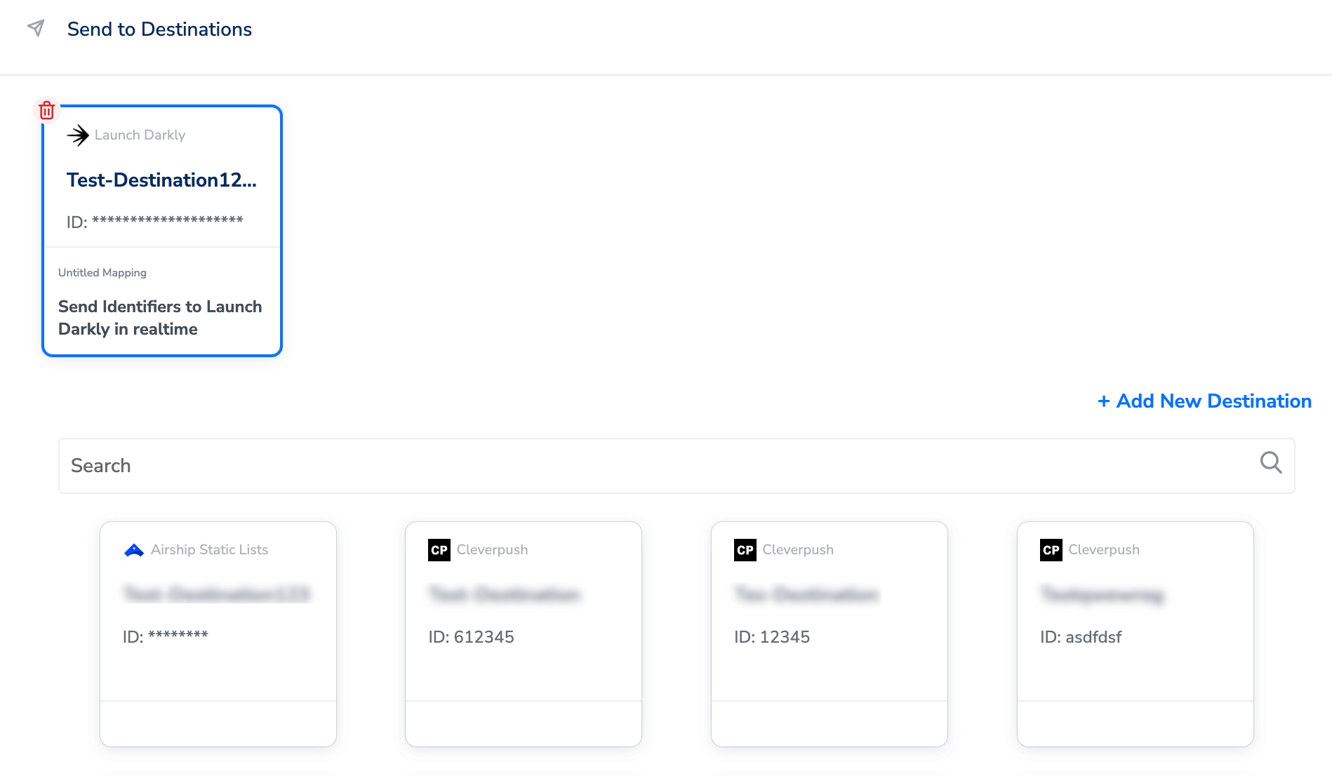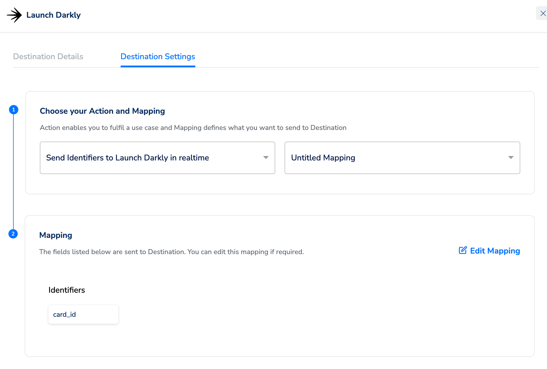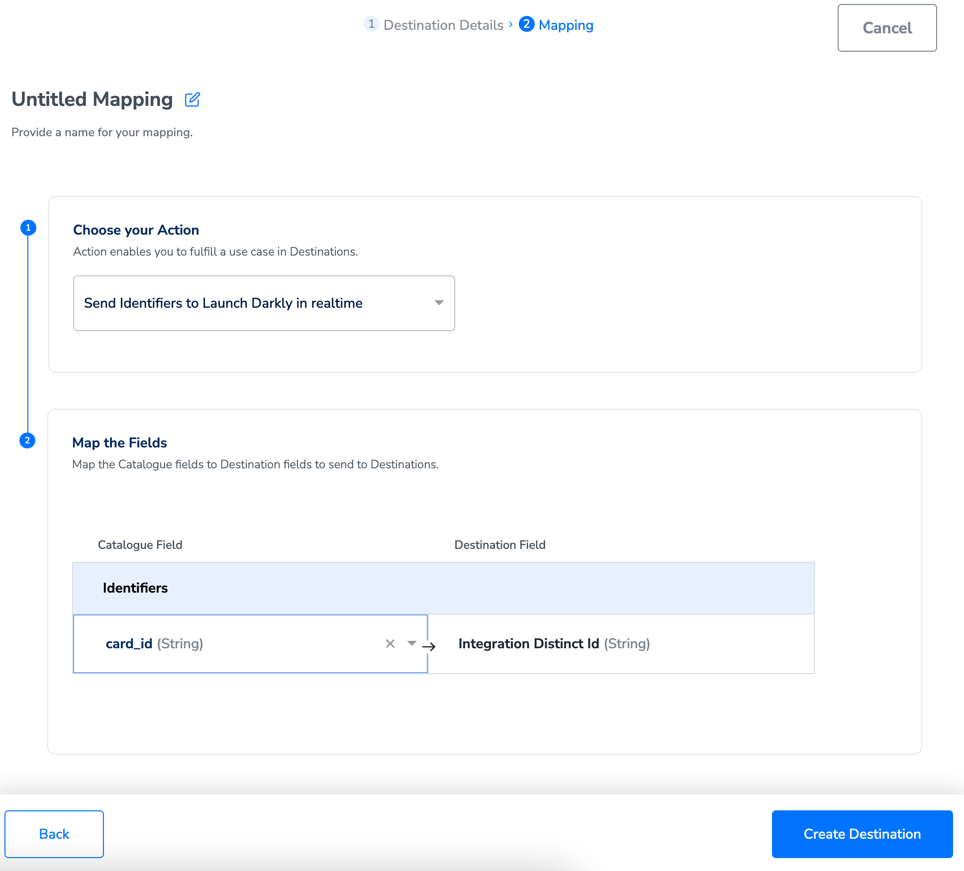 Perform the following steps to add a new destination:In the mapping screen that appears, under Choose your Action, select Send Identifiers to LaunchDarkly in realtime as the action for sending data to the workflow created in Journeys. Under Map the Fields, map the appropriate Catalogue fields to the Destination fields to send to Destination.