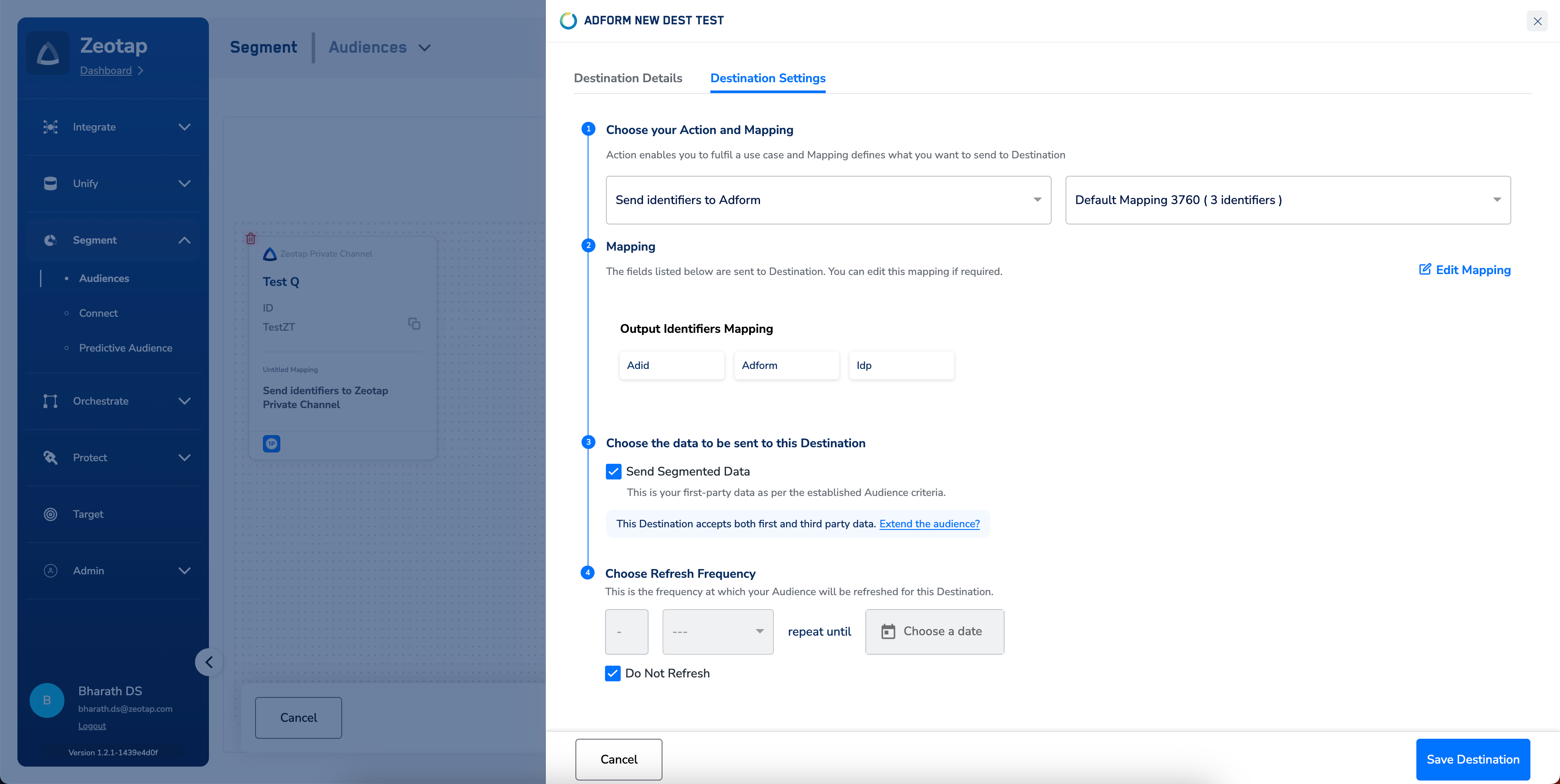 c. Under Choose the data to be sent to this Destination, the Send Segmented Data checkbox is selected by default. This enables you to share your first-party data. You can also include third-party data through the extensions offered. This is solely based on the data acceptance policy of the Destination you want to link with the Audience. To enable it, reach out to your Zeotap POC.