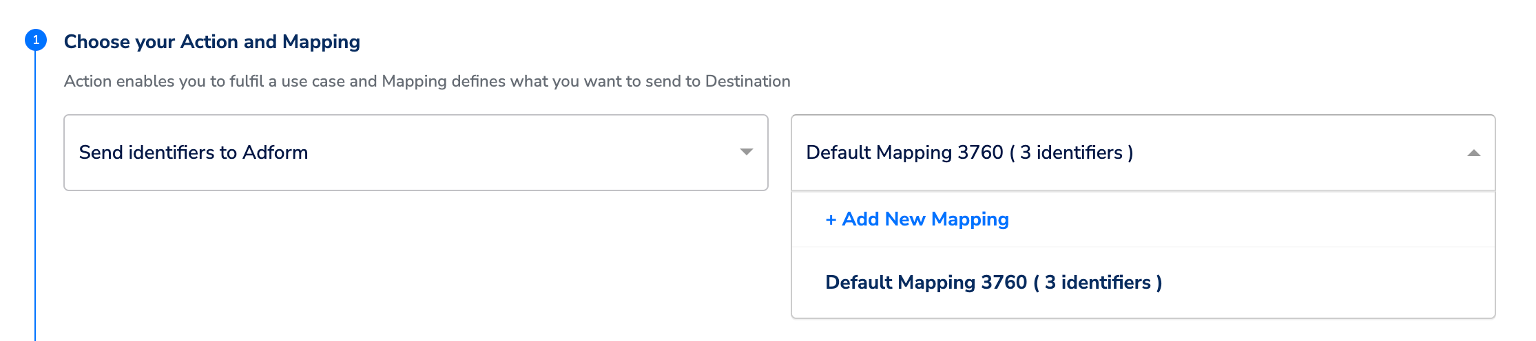 a. Under Choose your Action and Mapping, choose the desired use case from the left drop-down menu and then choose the corresponding mapping from the right drop-down menu. If the desired mapping is not available, then create a new one by using + Add New Mapping.