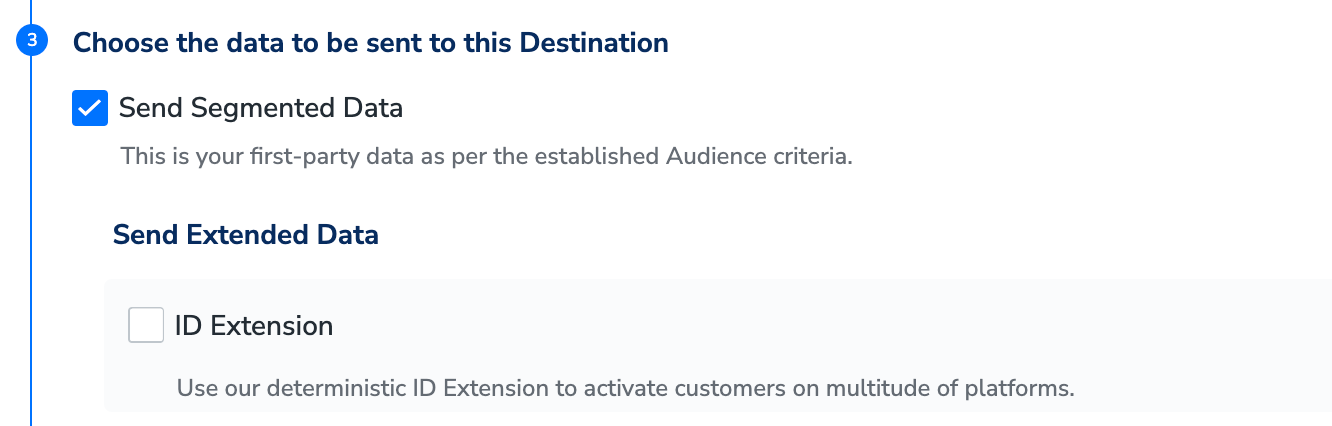 d. To apply the extensions (ID Extension and/or Lookalike), under Send Extended Data, click Extend the audience? and select the appropriate checkbox. To know more about the extensions and how to apply them, refer here.