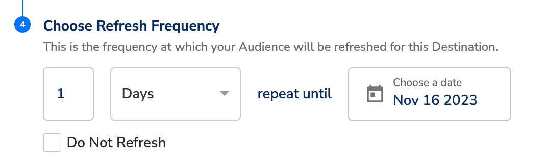 e. Under Choose Refresh Frequency, you can choose the frequency at which the Audiences are refreshed and sent to Destinations. You can choose intervals in days, weeks or months. Ensure that you provide an end date for the refresh cycle to proceed with the Destination creation.